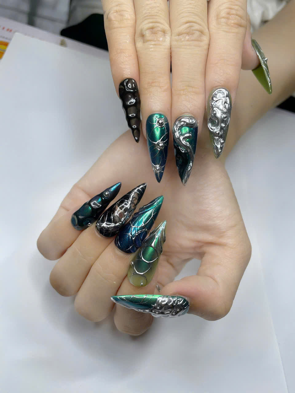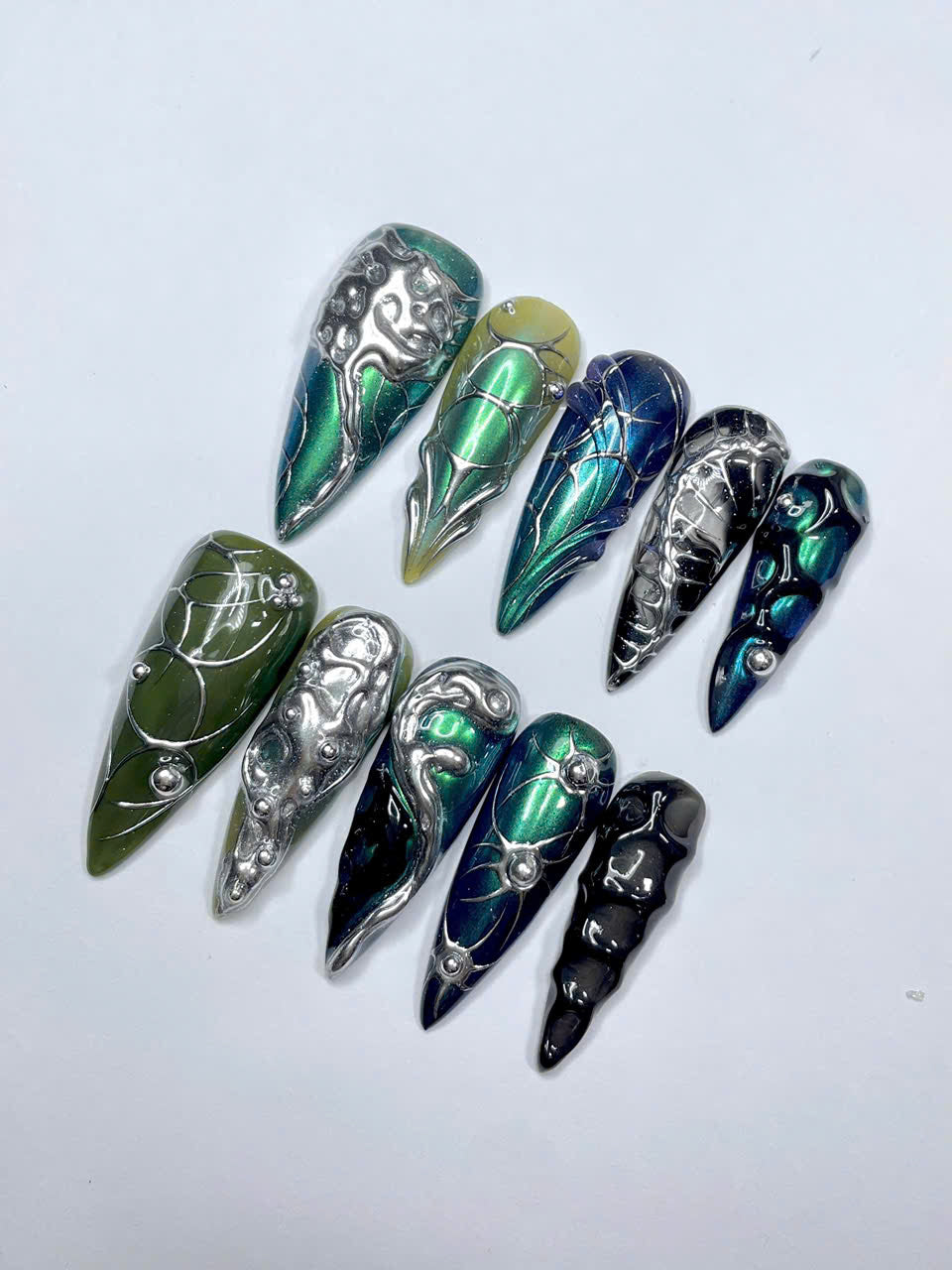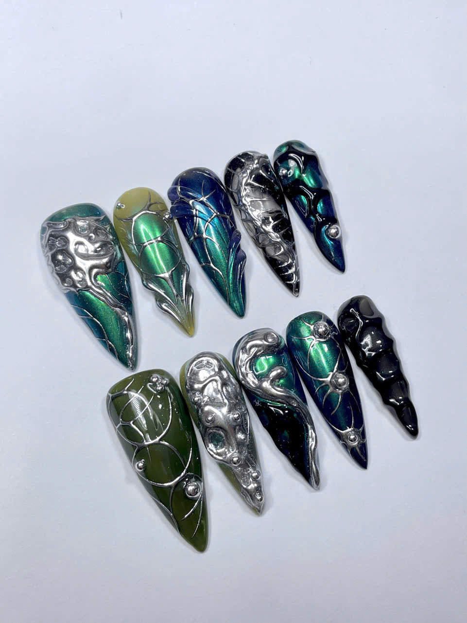 Unleash your inner alien with these dramatic, iridescent Bio-Mechanical press-on nails. Featuring a vibrant shift of emerald green to deep blue with organic, dripping liquid silver chrome accents. These reusable, high-quality Stiletto nails are a perfect statement piece for Futuristic, Cyberpunk, or Rave fashion.