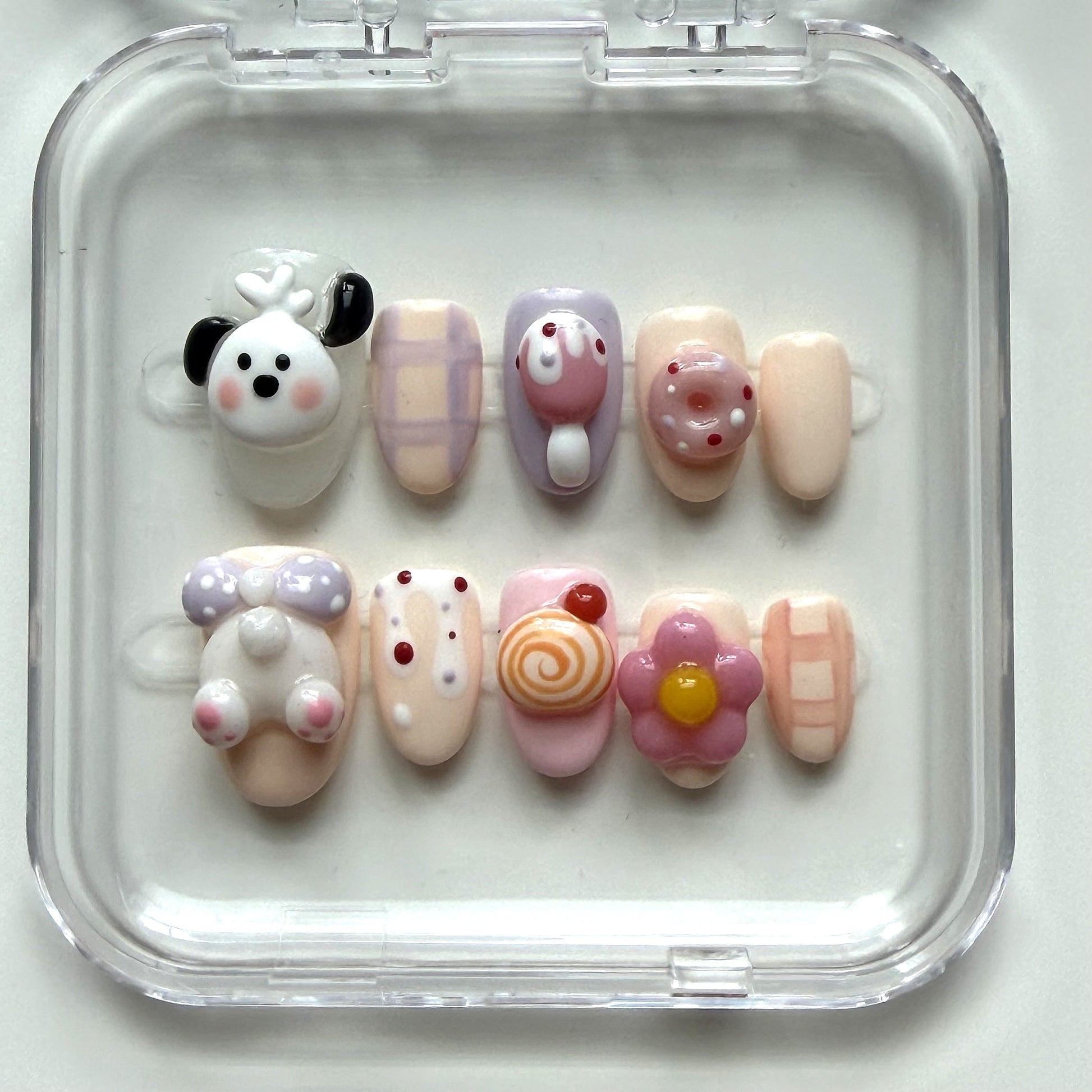 A playful pastel press-on nail set featuring sweet bunny charms, candy-inspired details, and soft picnic colors. Cute, fun, and handmade for the ultimate kawaii moment.