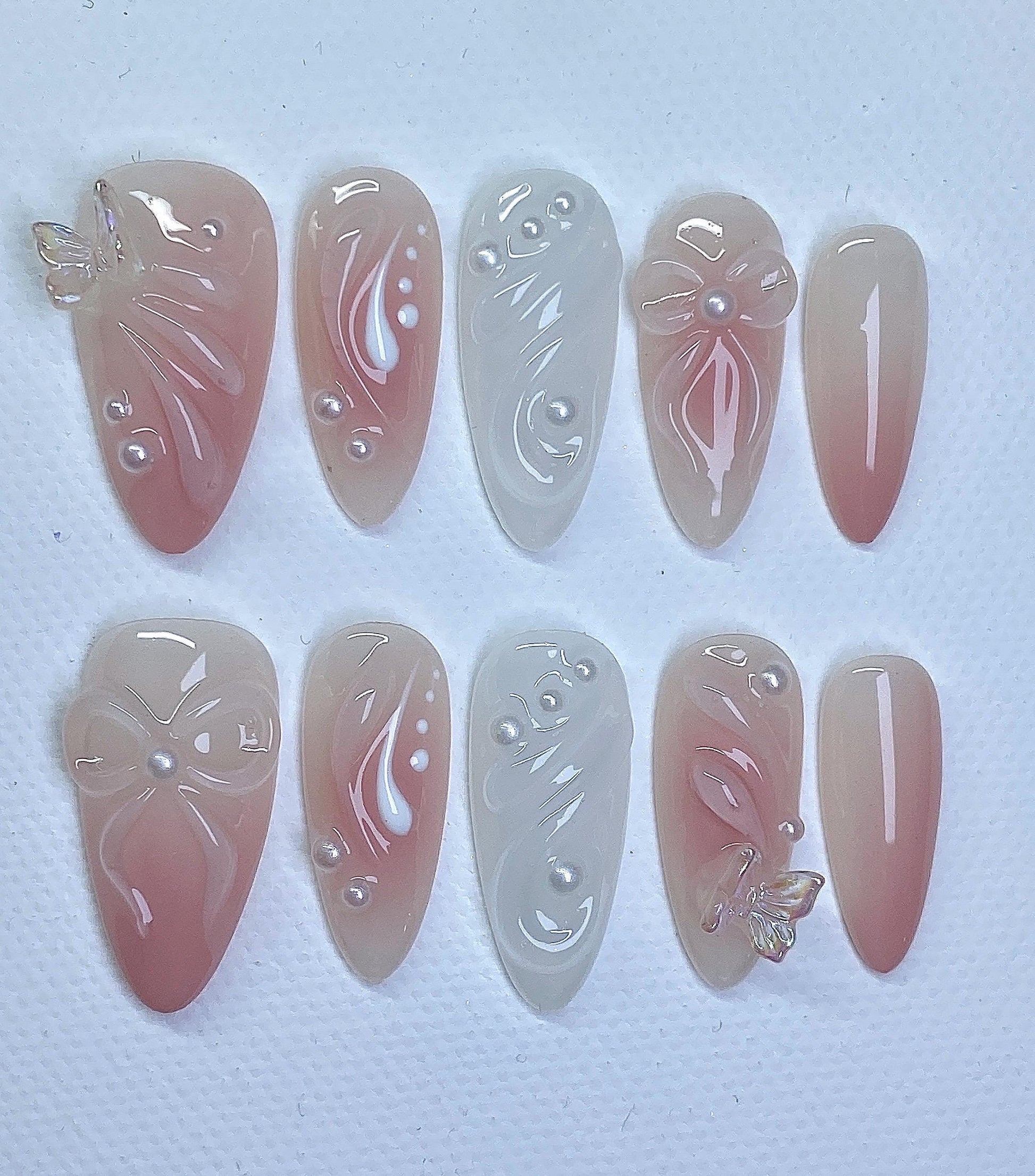Soft, romantic, and oh-so-dreamy ✨ This blush pink press-on nail set is adorned with 3D butterfly accents, pearl details, and delicate swirl art for the perfect balance of elegance and charm. Ideal for brides, weddings, parties, or anyone who loves a soft feminine aesthetic. 🦋💖