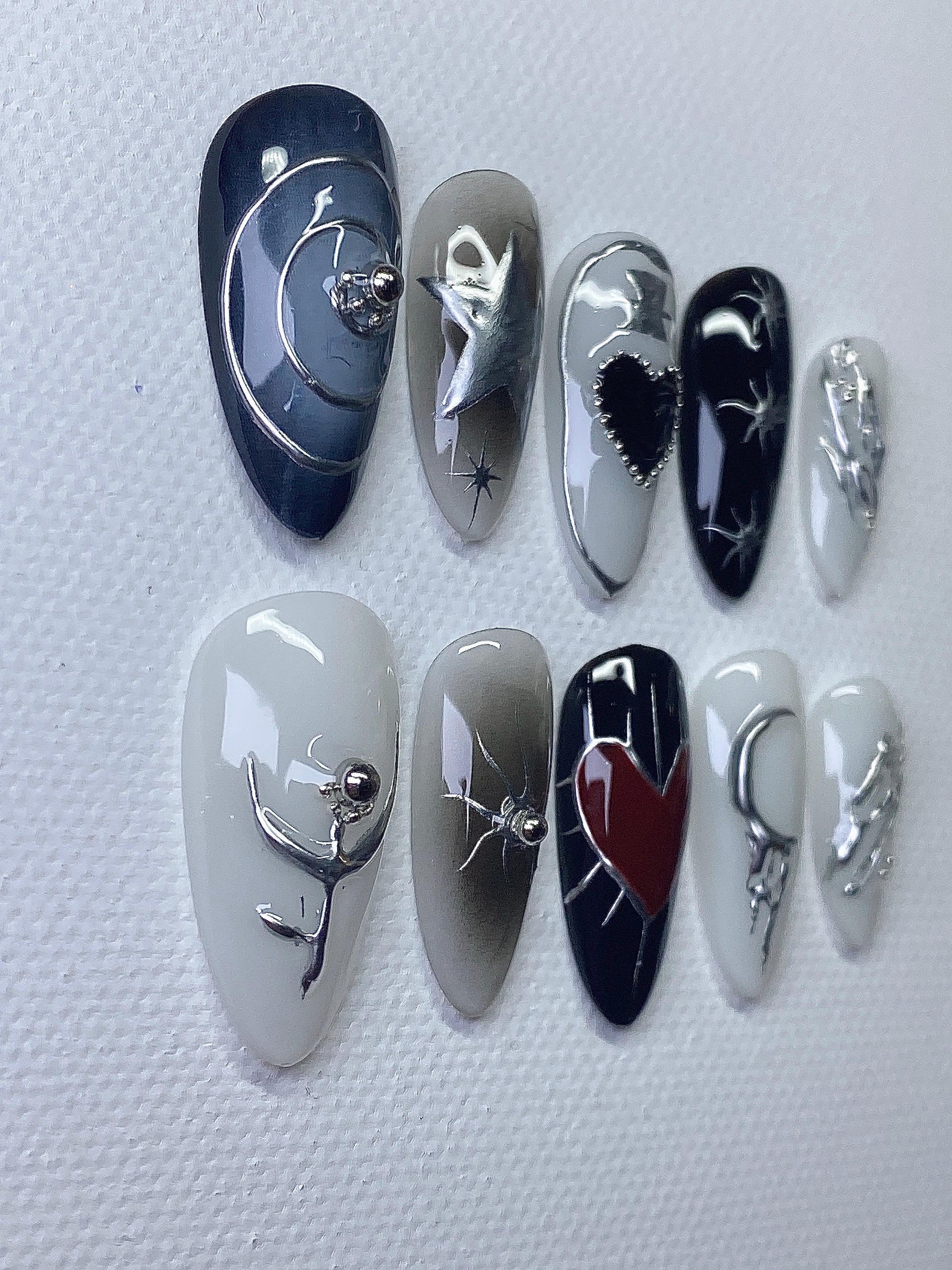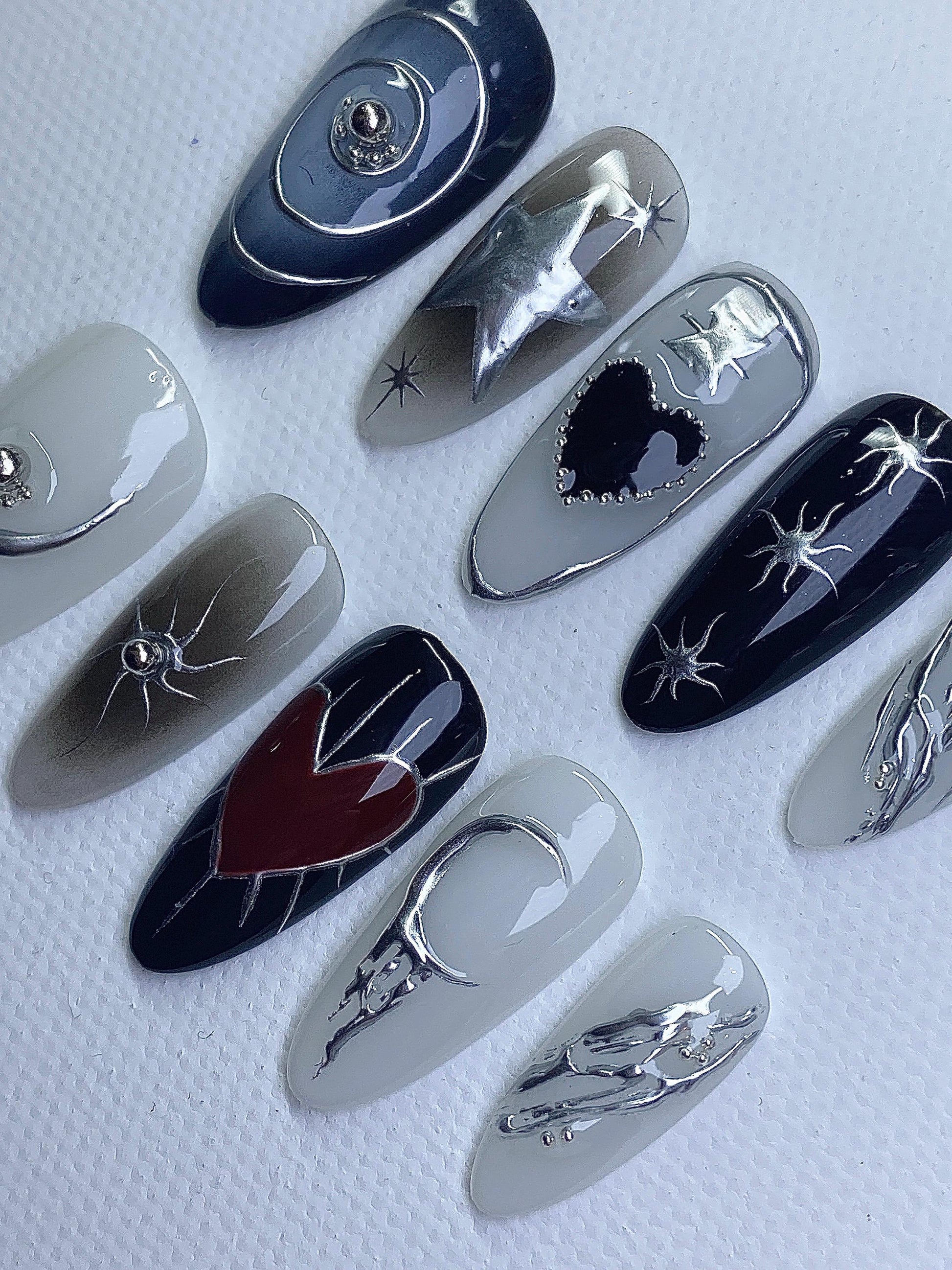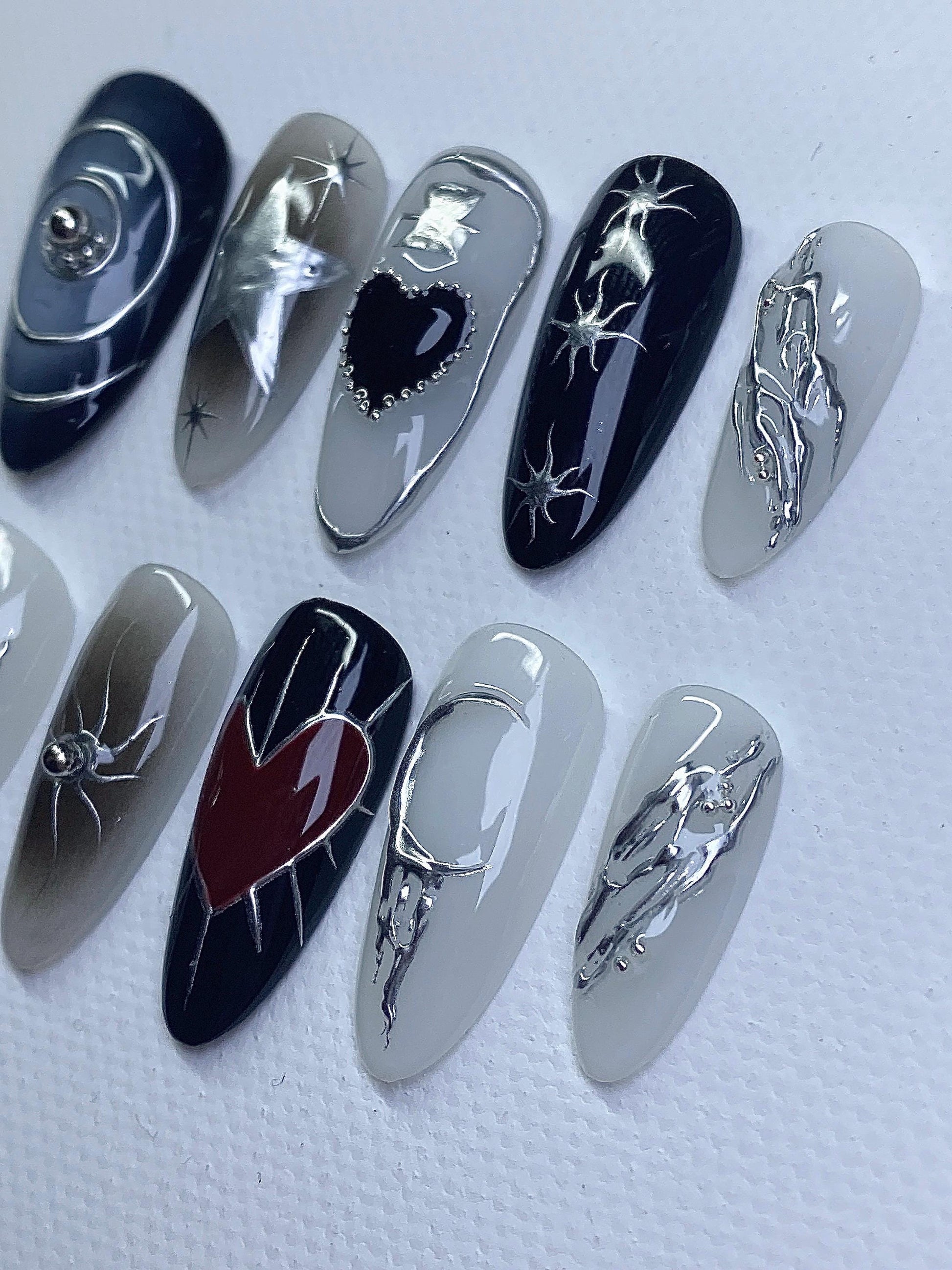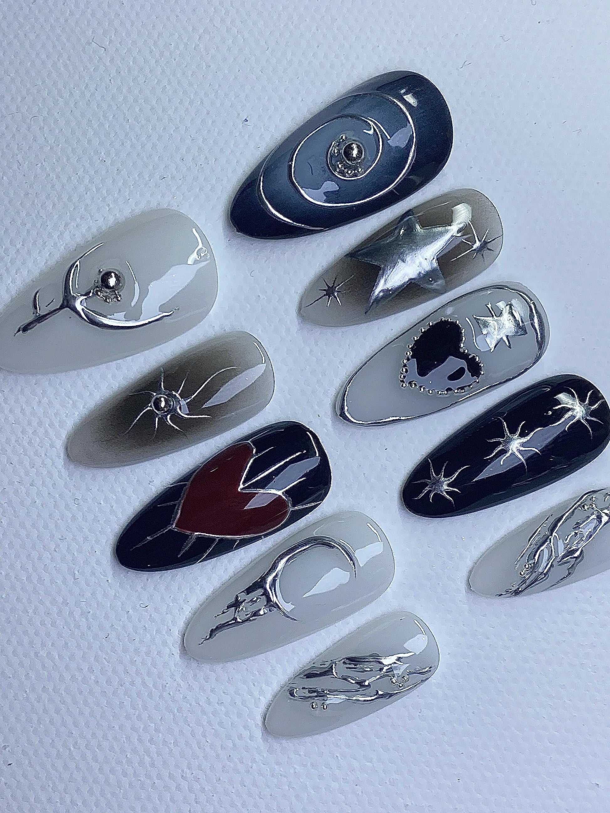 Elevate your look with this handcrafted celestial-inspired press-on nail set, designed for those who love bold, artistic, and statement-making styles. Featuring a stunning mix of cosmic and gothic elements, each nail is detailed with 3D metallic accents, stars, moons, hearts, and abstract textures that catch the light beautifully.