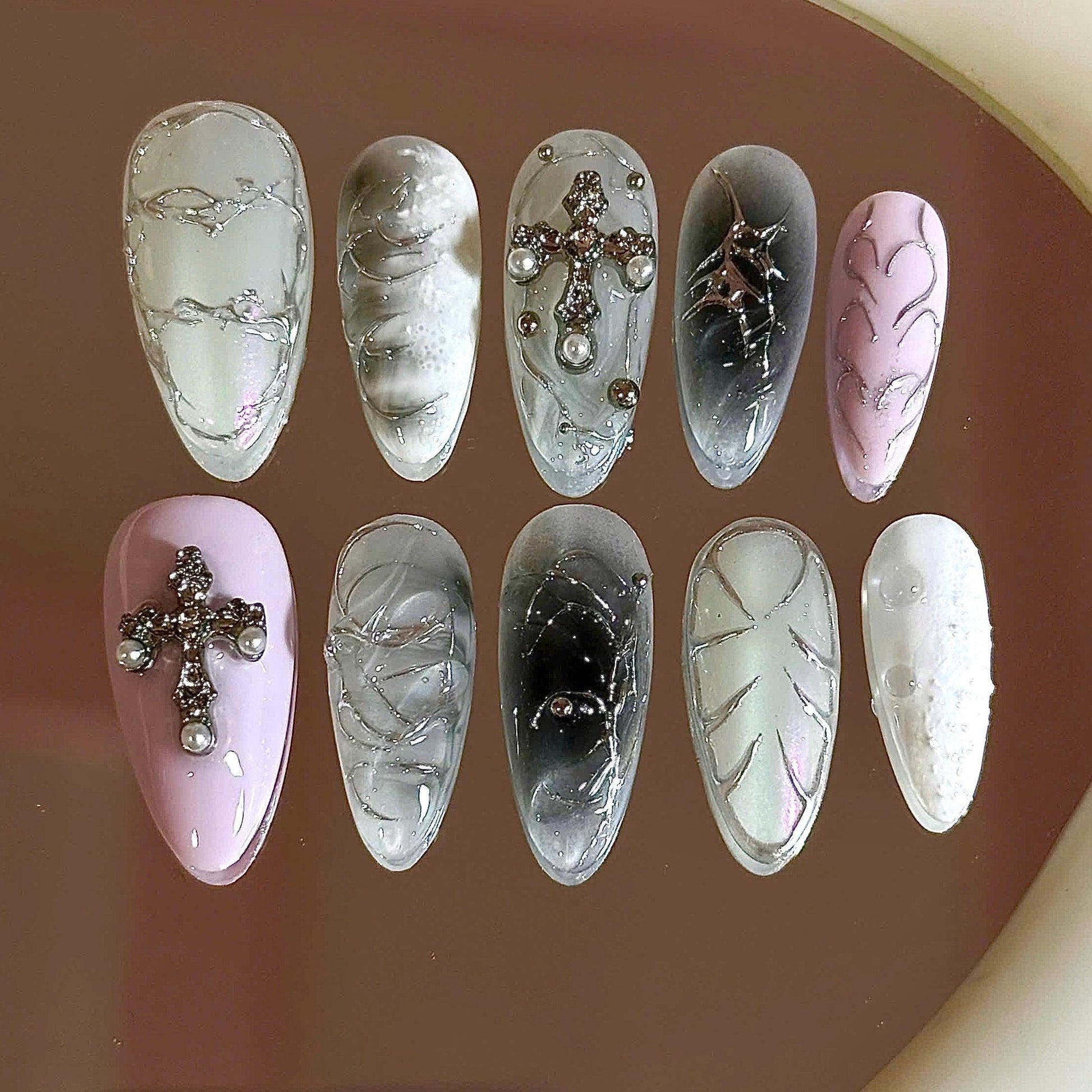 🔖 Keywords: gothic nails, cross nails, pearl press-on nails, black nails, luxury handmade nails, gothic fashion nails, edgy nails, reusable press-on nails, marble nails.#GothicNails #CrossNails #MarbleNails #DarkNails #LuxuryNails #StatementNails #PressOnNails #CustomPressOnNails #BlackNails #PearlNails #EdgyNails #ReusableNails #HandmadeNails #AlternativeNails #EtsyNails