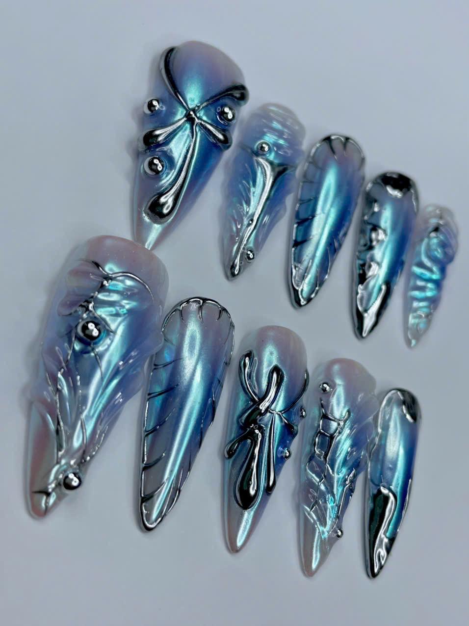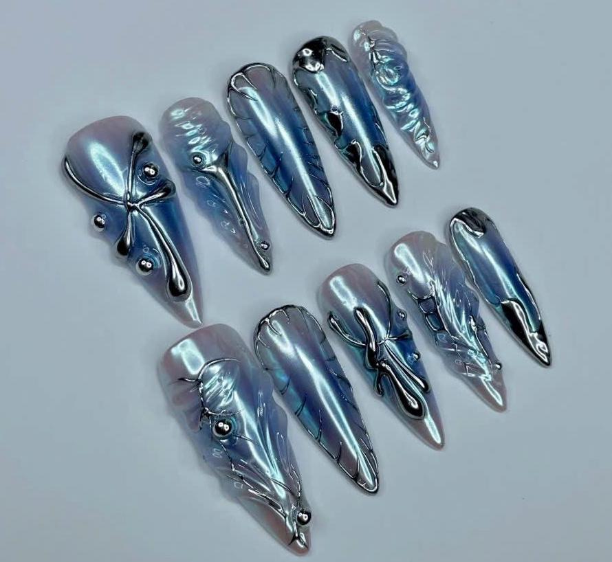 ⚡ Handcrafted with cosmic metallic finishes, 3D chrome textures, and serpent-inspired swirls – these nails embody both power and elegance. Step into your otherworldly energy and let your nails speak the language of the stars.