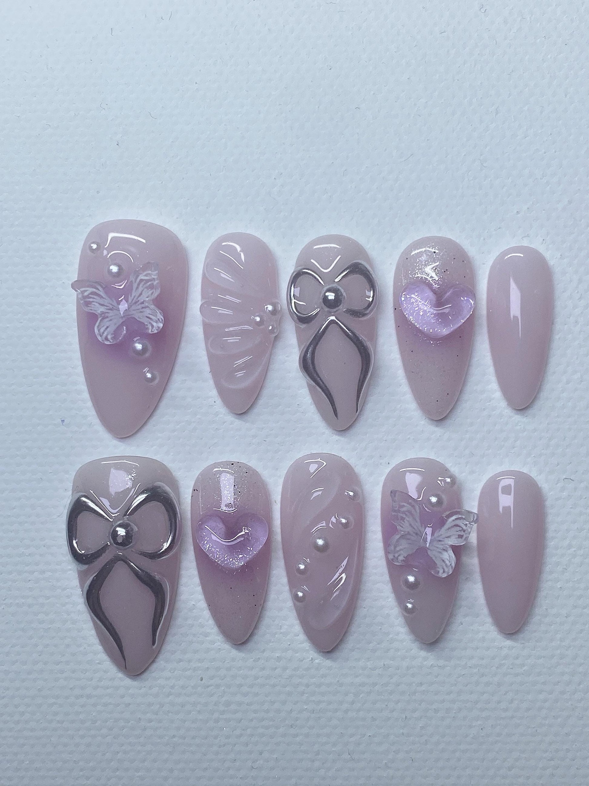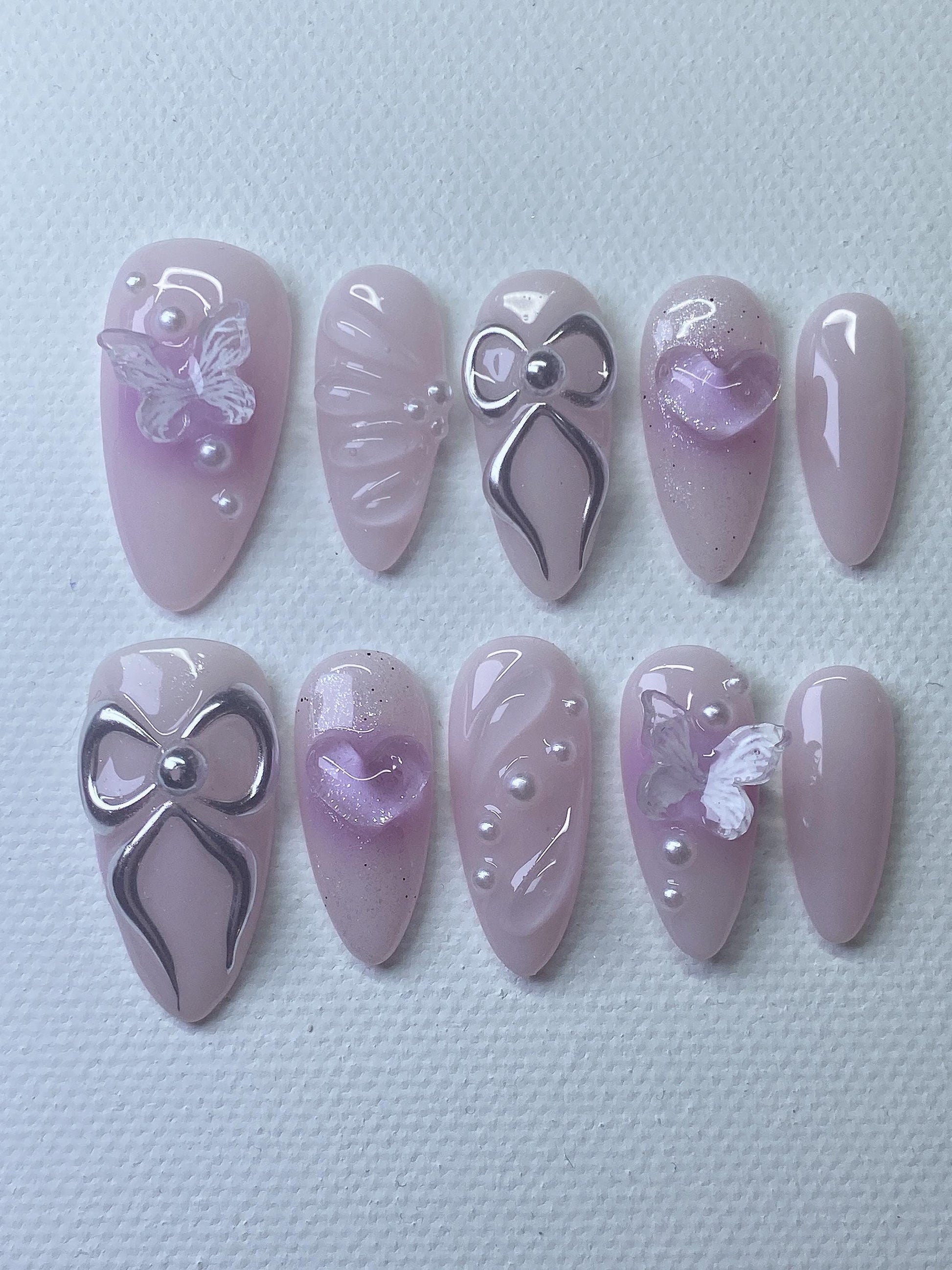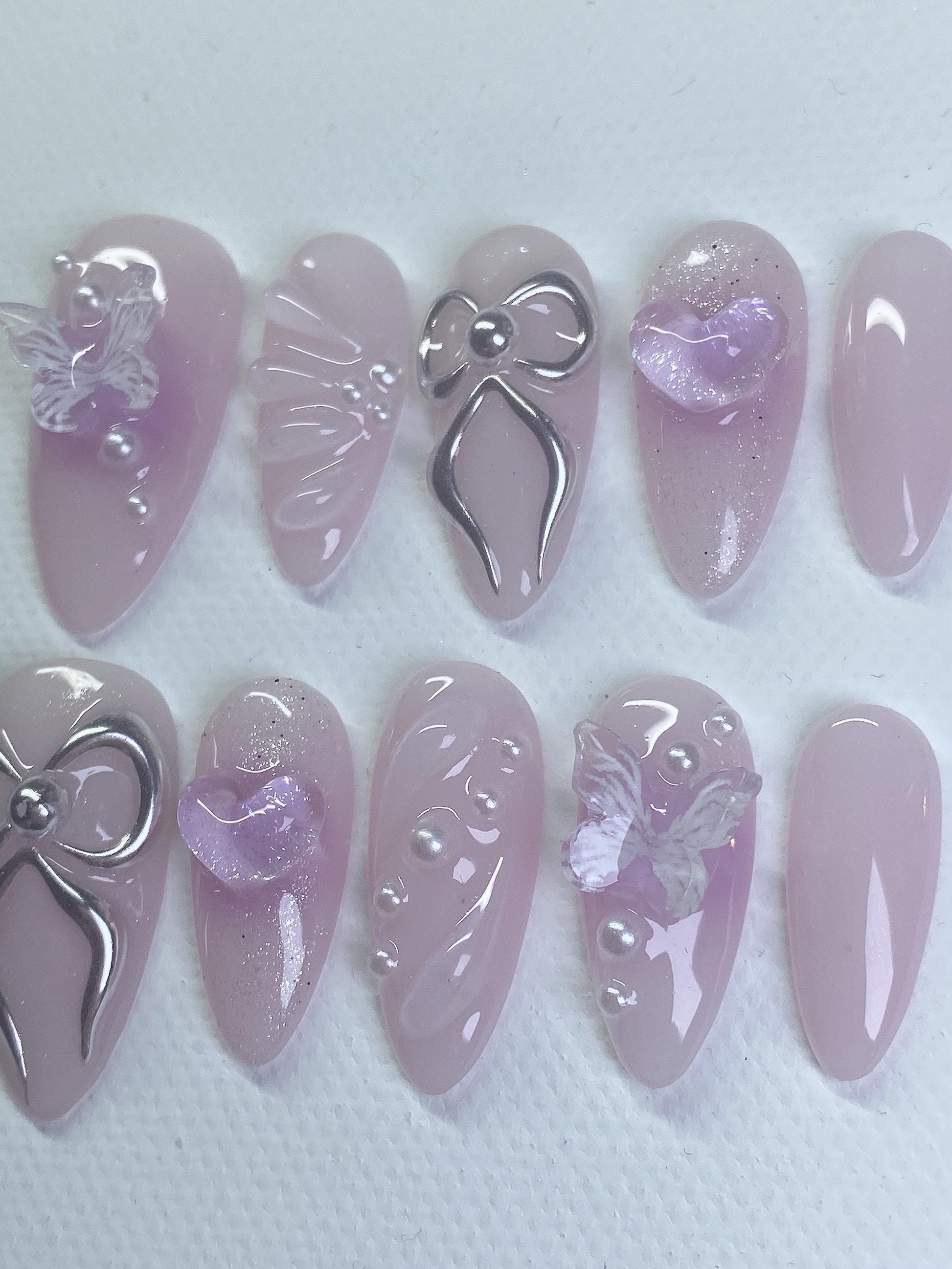 Fall in love with your manicure with our Purple Reign Nails set – a dreamy and romantic set designed for elegance and charm. Featuring a soft shimmery purple base with glossy 3D heart and swirl accents, these nails give off a delicate, ethereal glow that's perfect for any occasion.