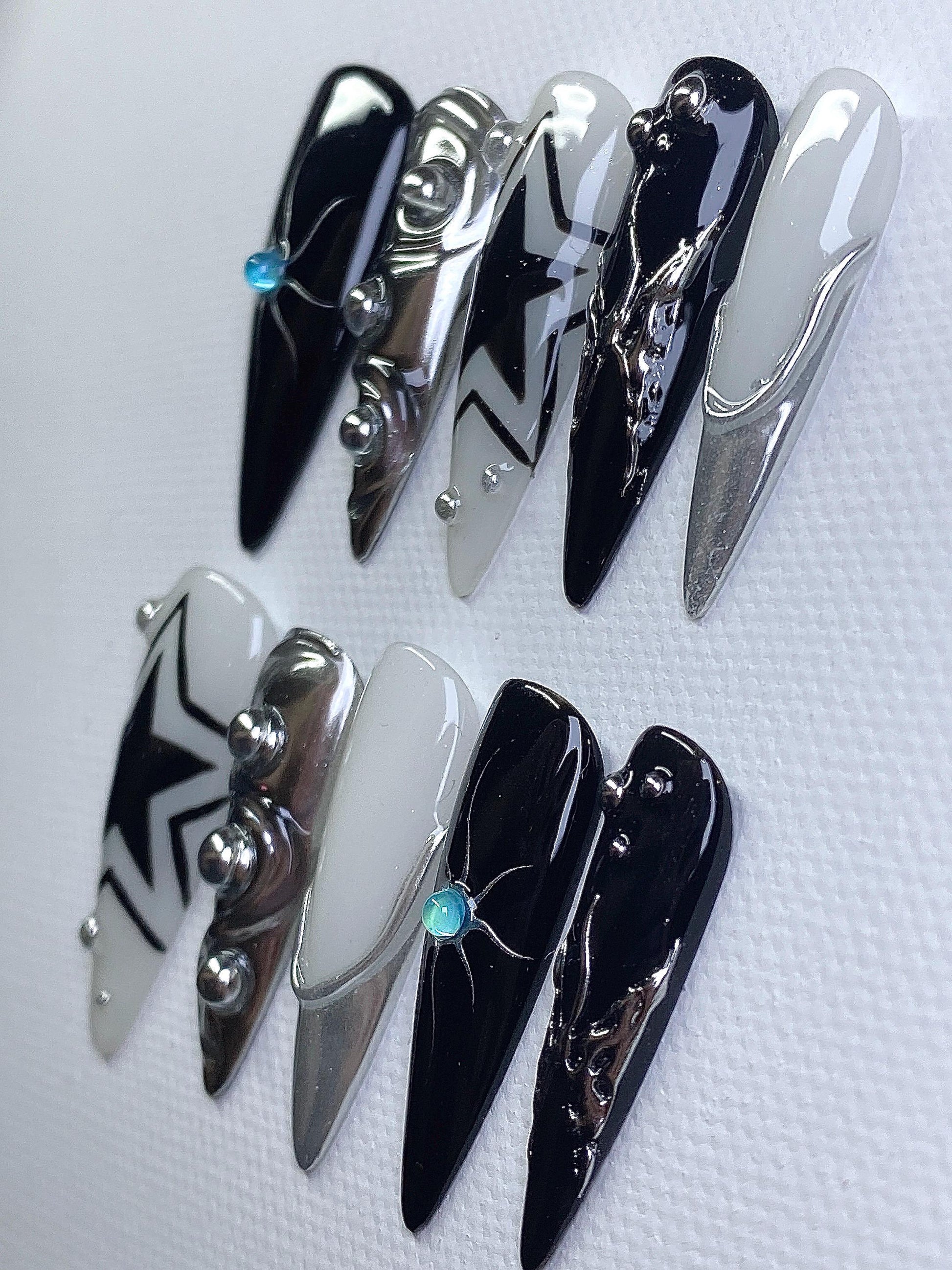 This 10-piece set features a stunning variety of handcrafted designs, including 3D chrome accents, gothic crosses, abstract patterns. Perfect for making a statement, each nail is meticulously designed in sleek black, silver, and white tones for a high-impact look.