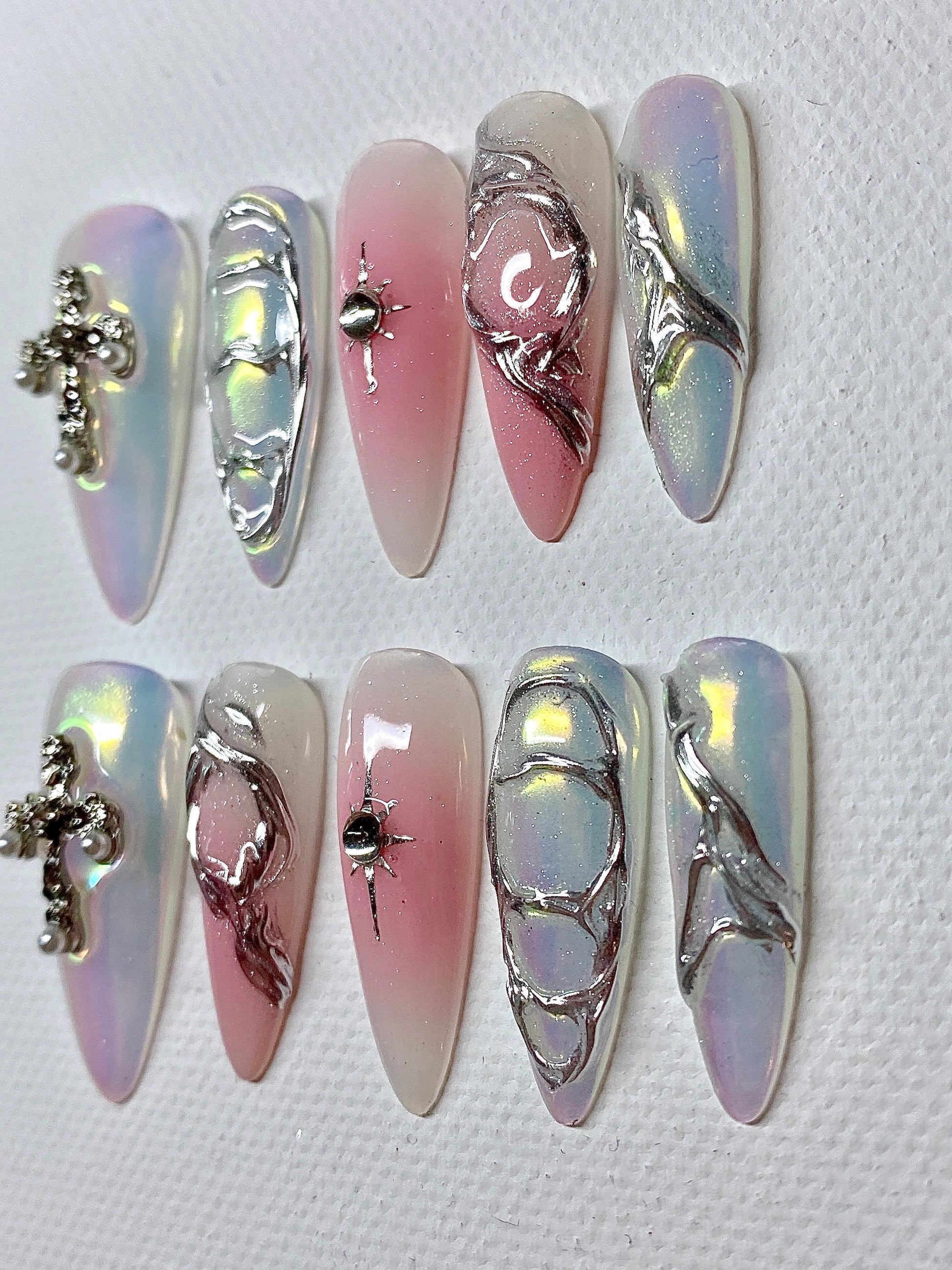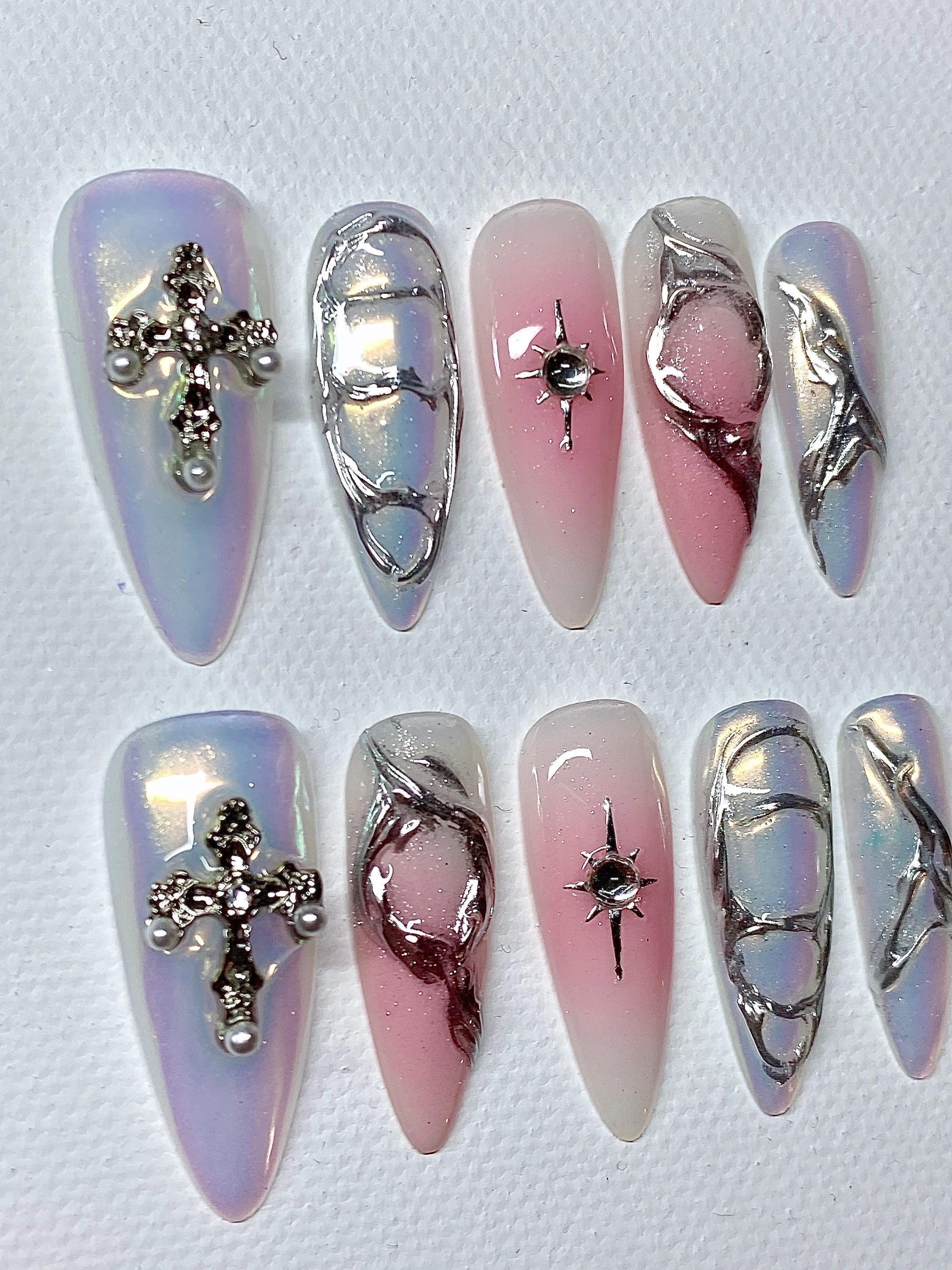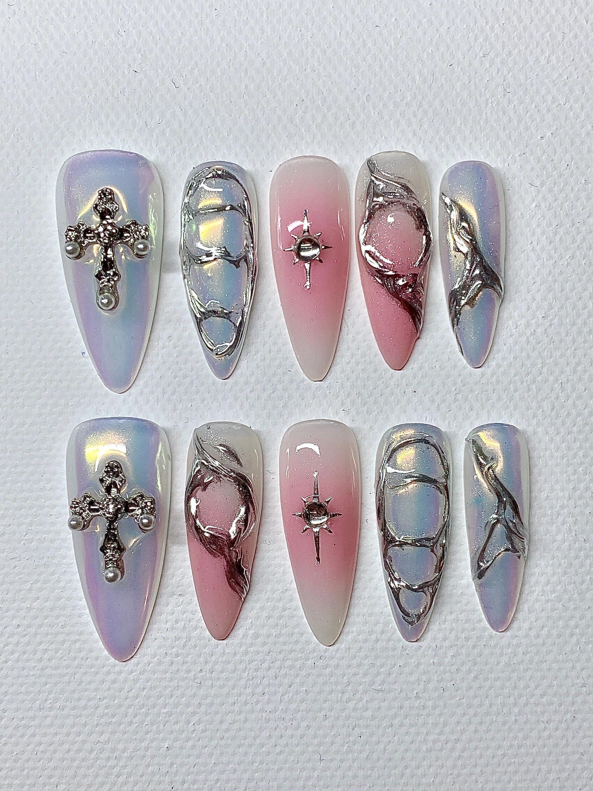#DivineAura #CrossNails #GothicNails #HolographicNails #PinkOmbreNails #3DNails #PearlNails #CelestialNails #EdgyNails #AlternativeNails #HandmadePressOns #EtsyNails #GothicGlam #DarkAestheticNails #StatementNails