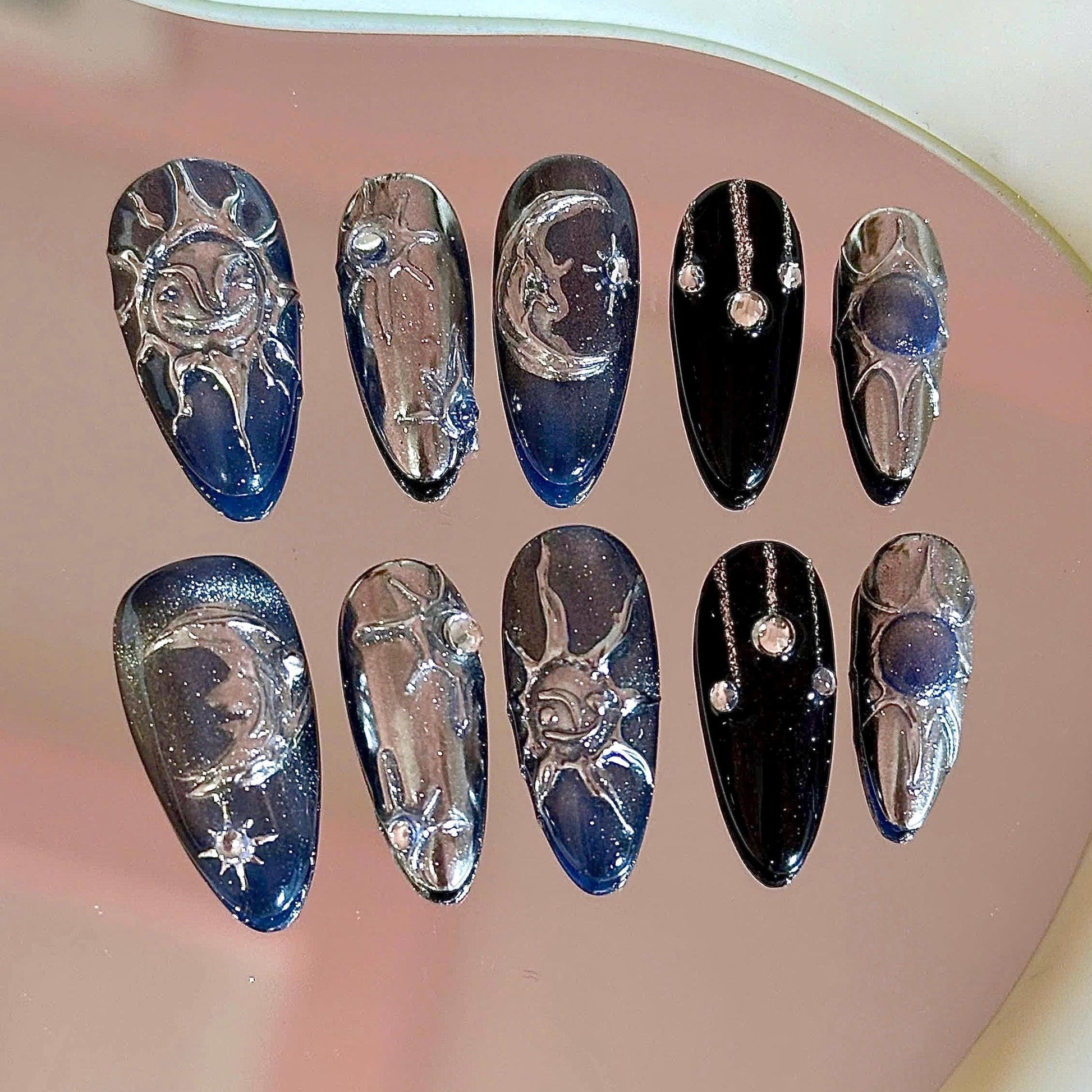 #MidnightSunNails #CelestialNails #MoonNails #SunAndMoonNails #GalaxyNails #CosmicNails #WitchyNails #AstrologyNails #ChromeNails #StarNails #PressOnNails #GothicNails #CelestialBeauty
