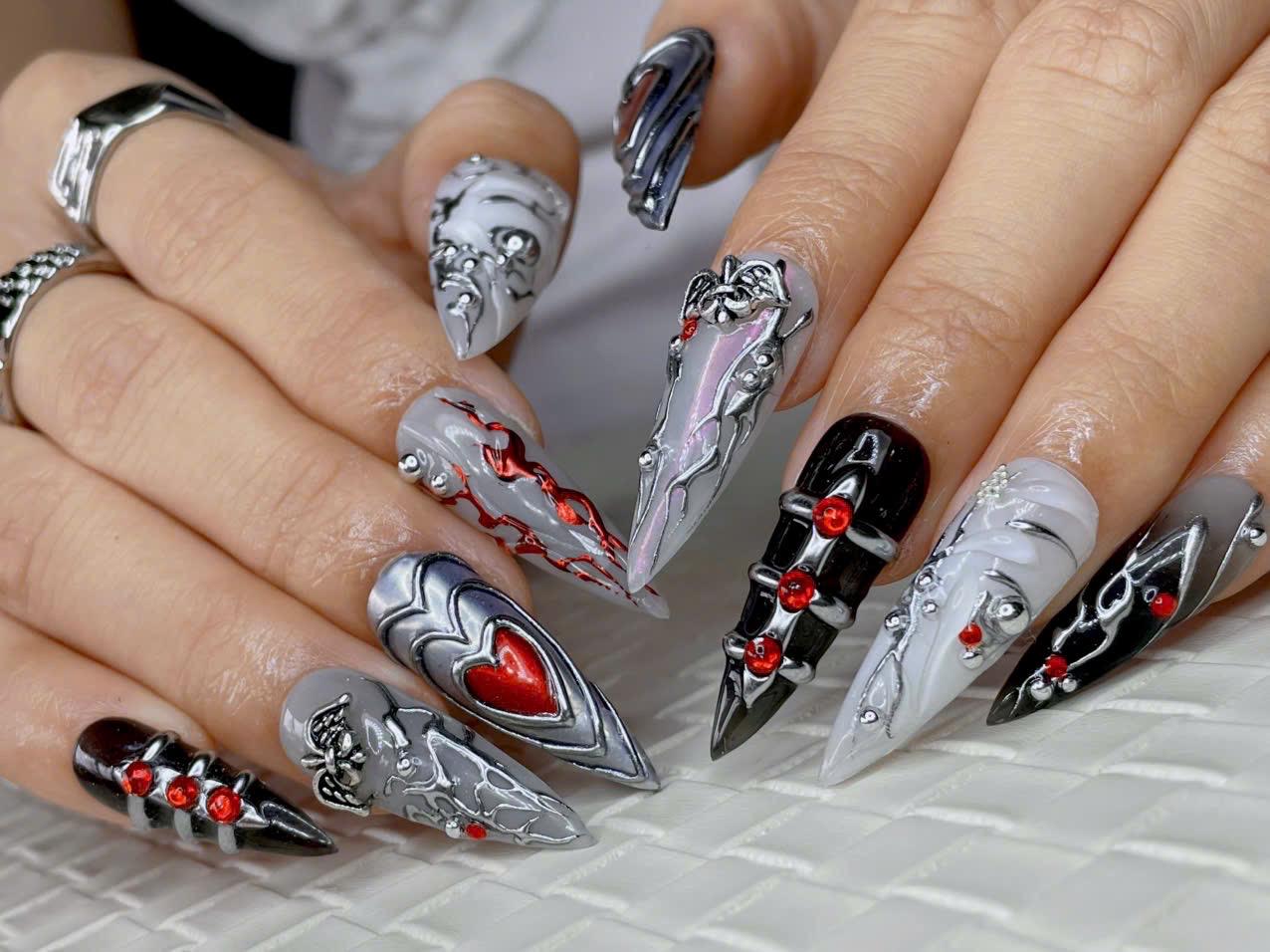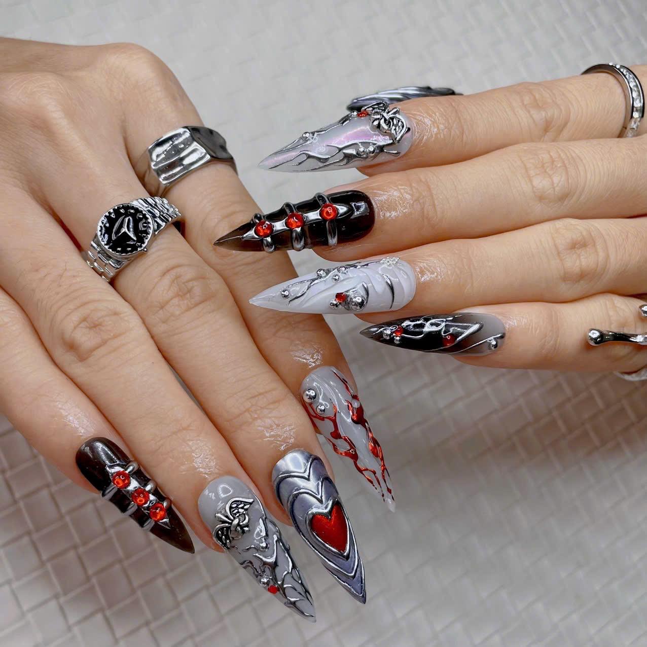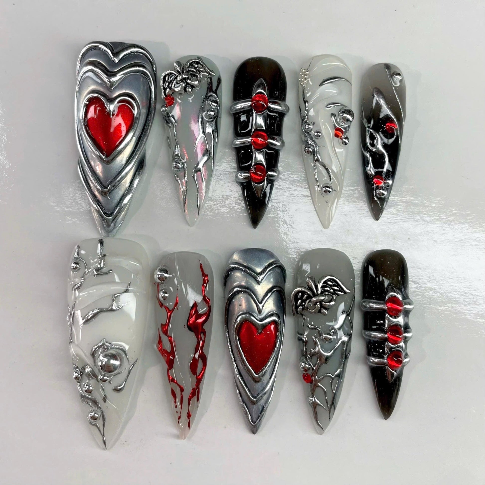 Steel Heart ❤️🔥 – A fierce blend of romance and rebellion. These chrome press-on nails feature bold 3D red hearts, silver metallic detailing, and gothic vibes for a dramatic statement. Perfect for Valentine’s Day, gothic fashion, or anyone who loves edgy elegance with a dark twist.
