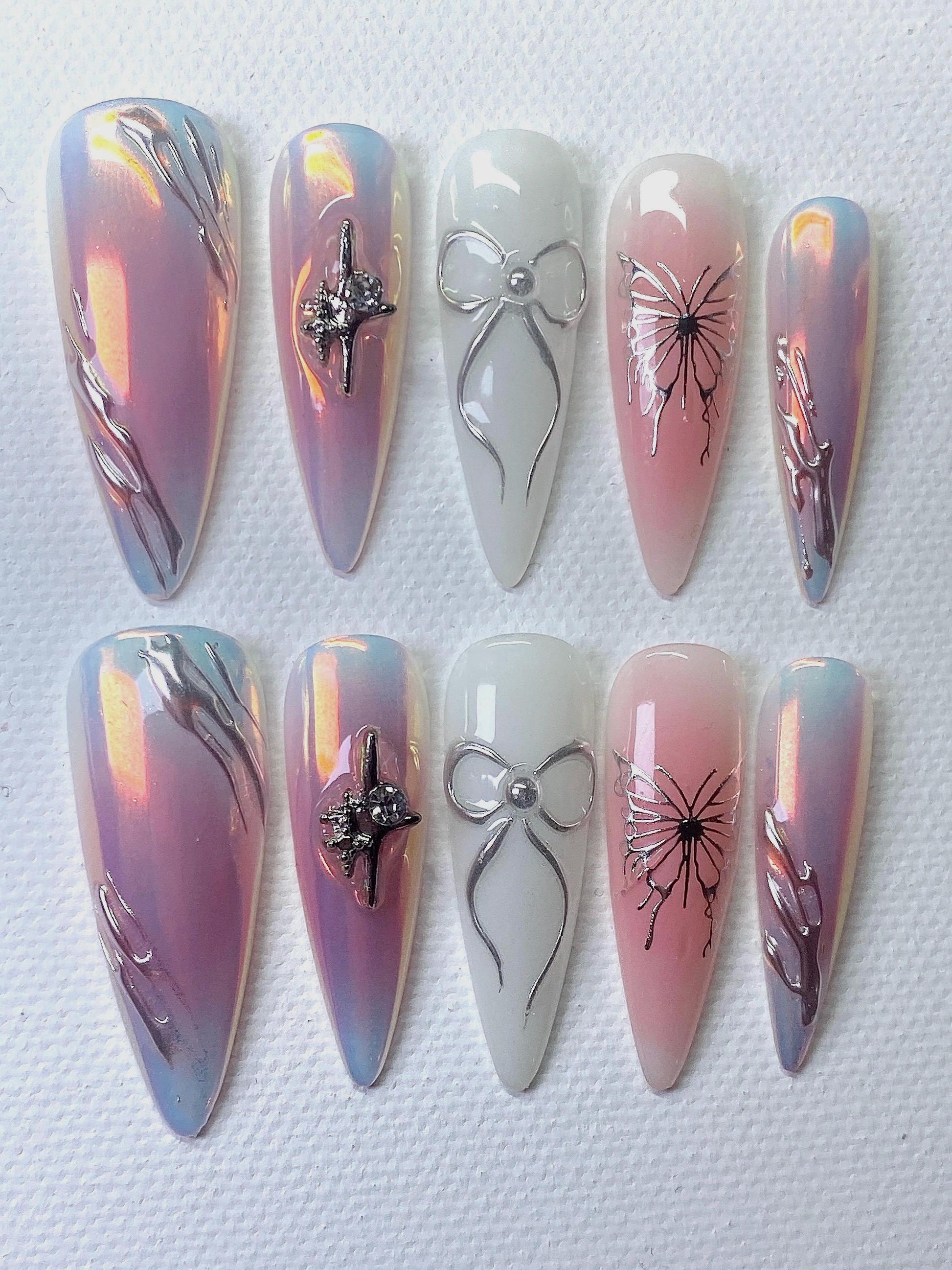 #ChromeNails #ButterflyNails #BowNails #SilverNails #PressOnNails #3DNailArt #LuxuryNails #CustomPressOnNails #HolographicNails #WeddingNails #BridalNails #ReusableNails #HandmadeNails #StatementNails #EtsyNails