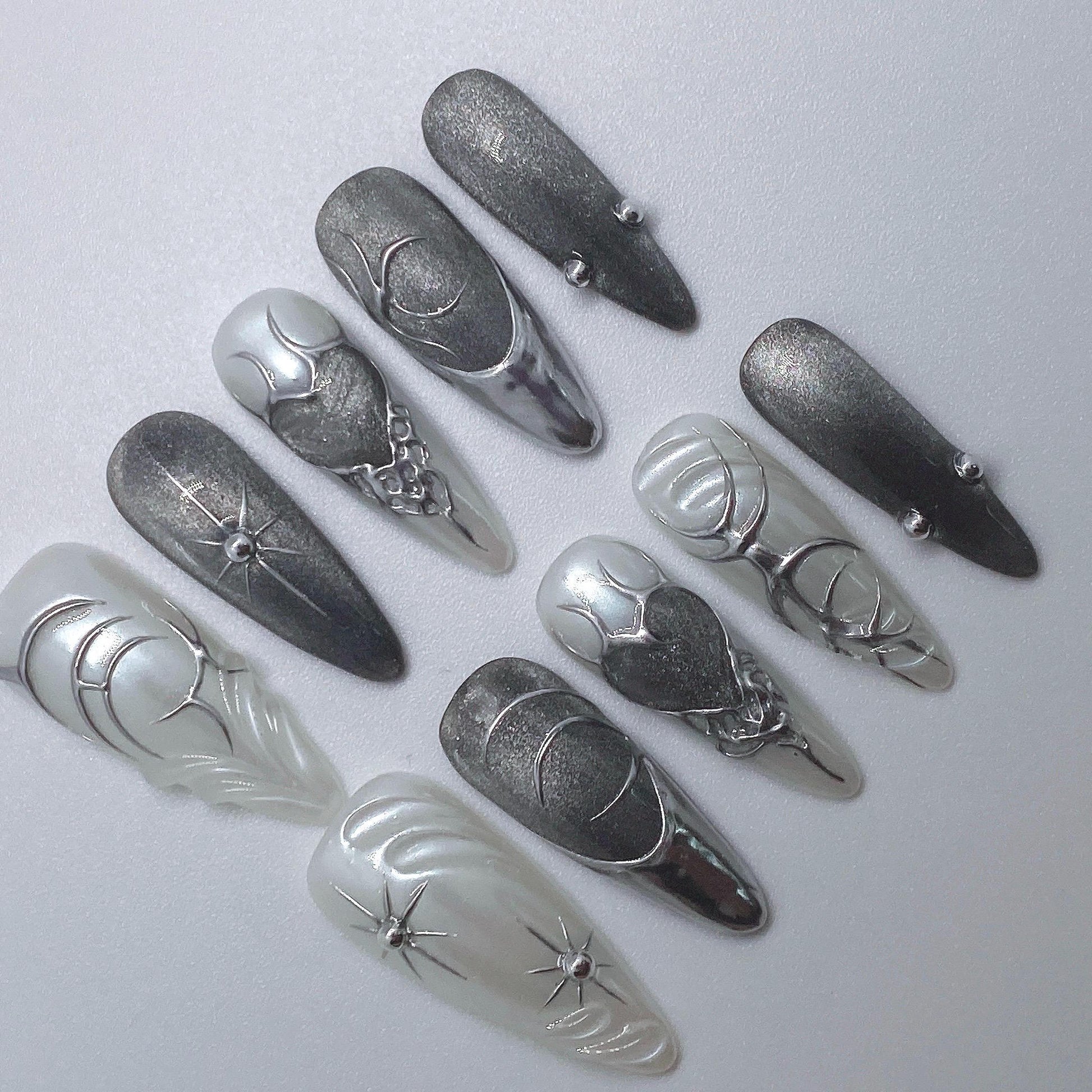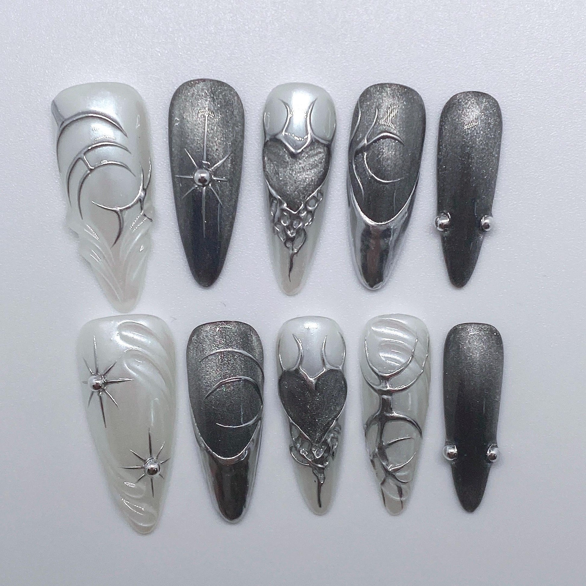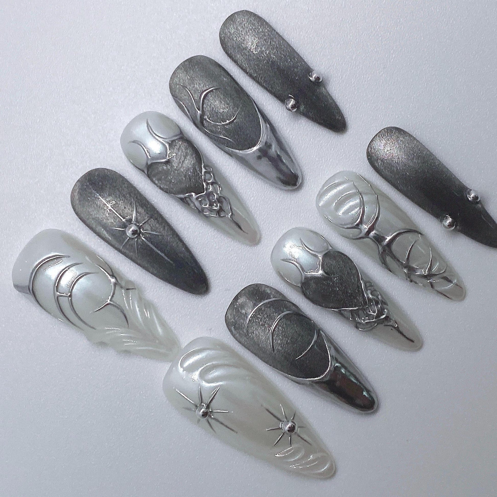 #LunarEclipseNails #CelestialNails #BlackAndWhiteNails #ChromeNails #SpaceNails #GothicNails #LuxuryPressOns #HandmadeNails #MoonNails #StarNails #CosmicNails #GalaxyNails #EtsyNails #DarkAestheticNails #AstroNails