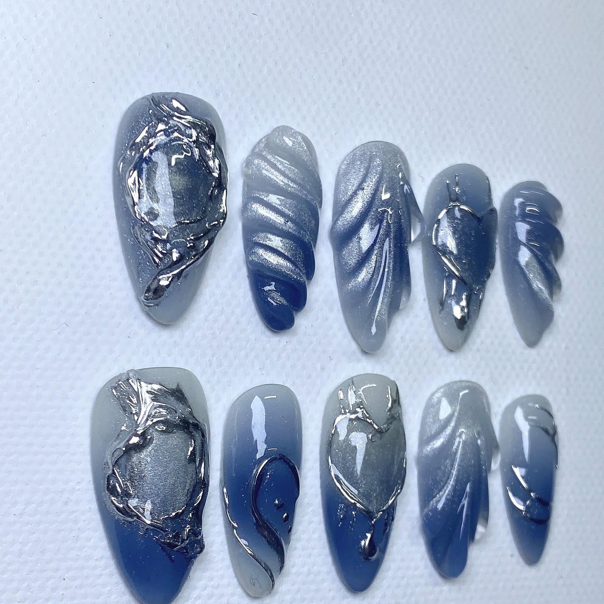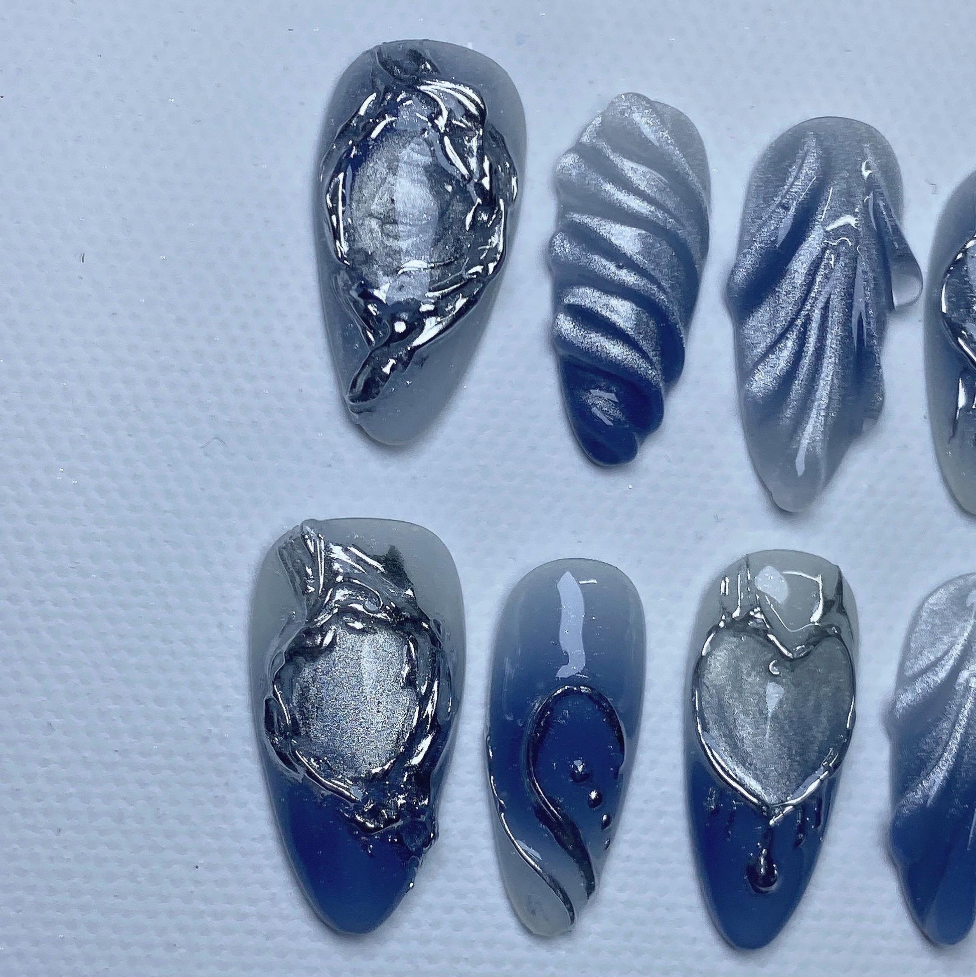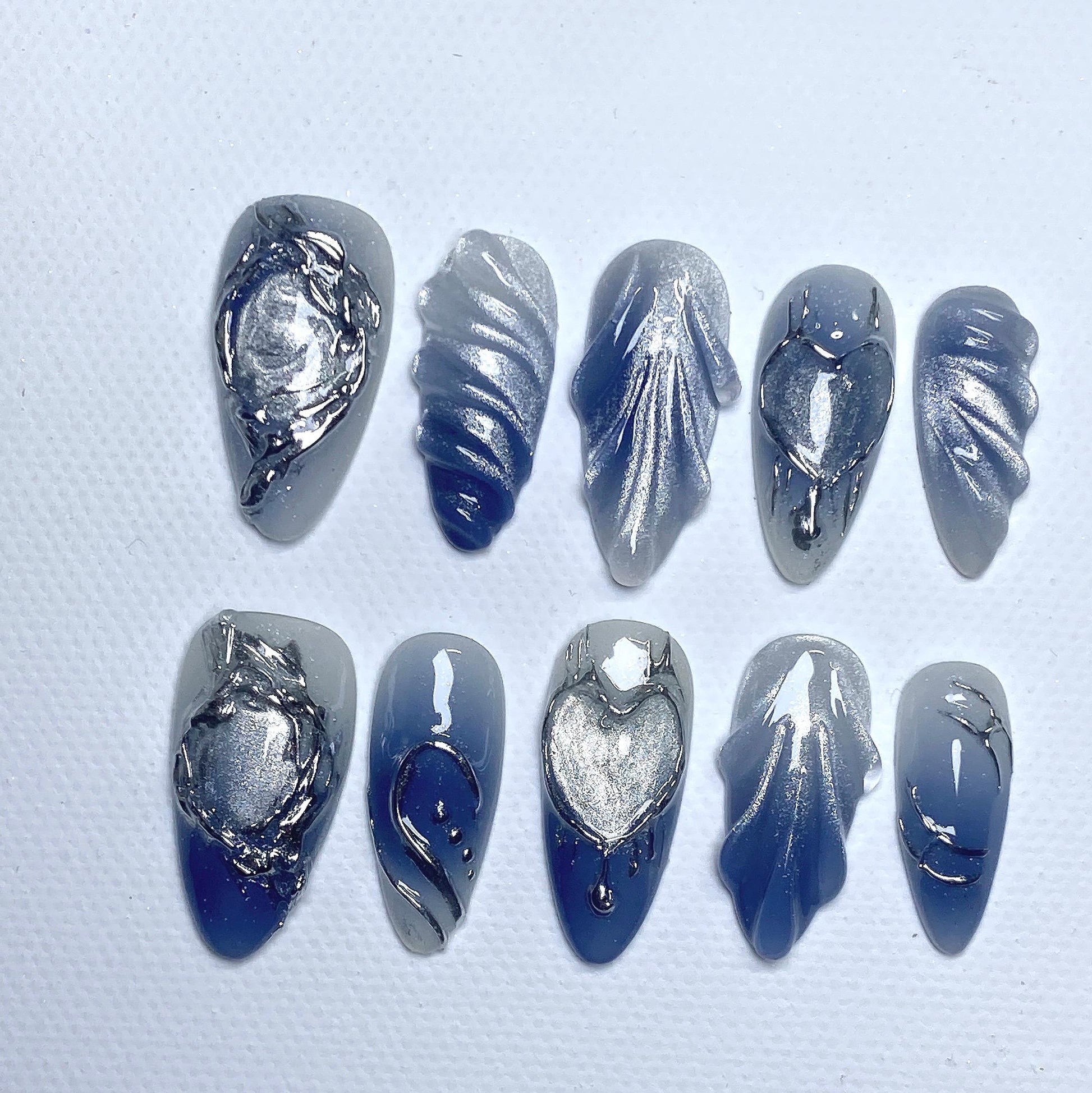 Dare to stand out with Metallic Heartbreaker Press-On Nails π€β¨ β a bold and futuristic nail set that blends gothic romance with cyberpunk edge. Featuring sculpted chrome textures, silver metallic hearts, and dimensional detailing, these nails are designed for those who love to make a statement.