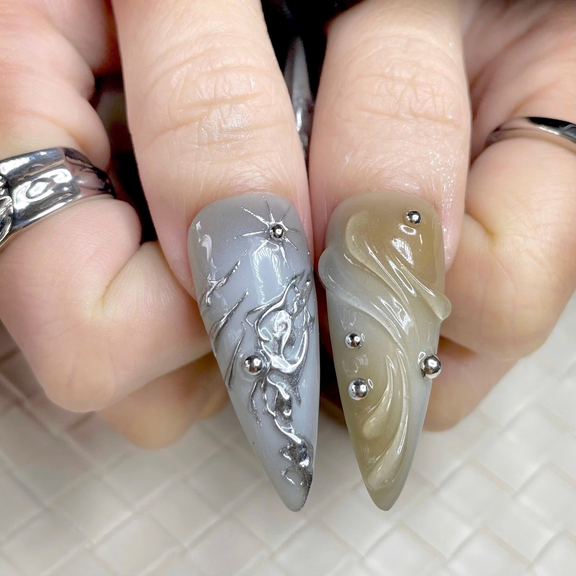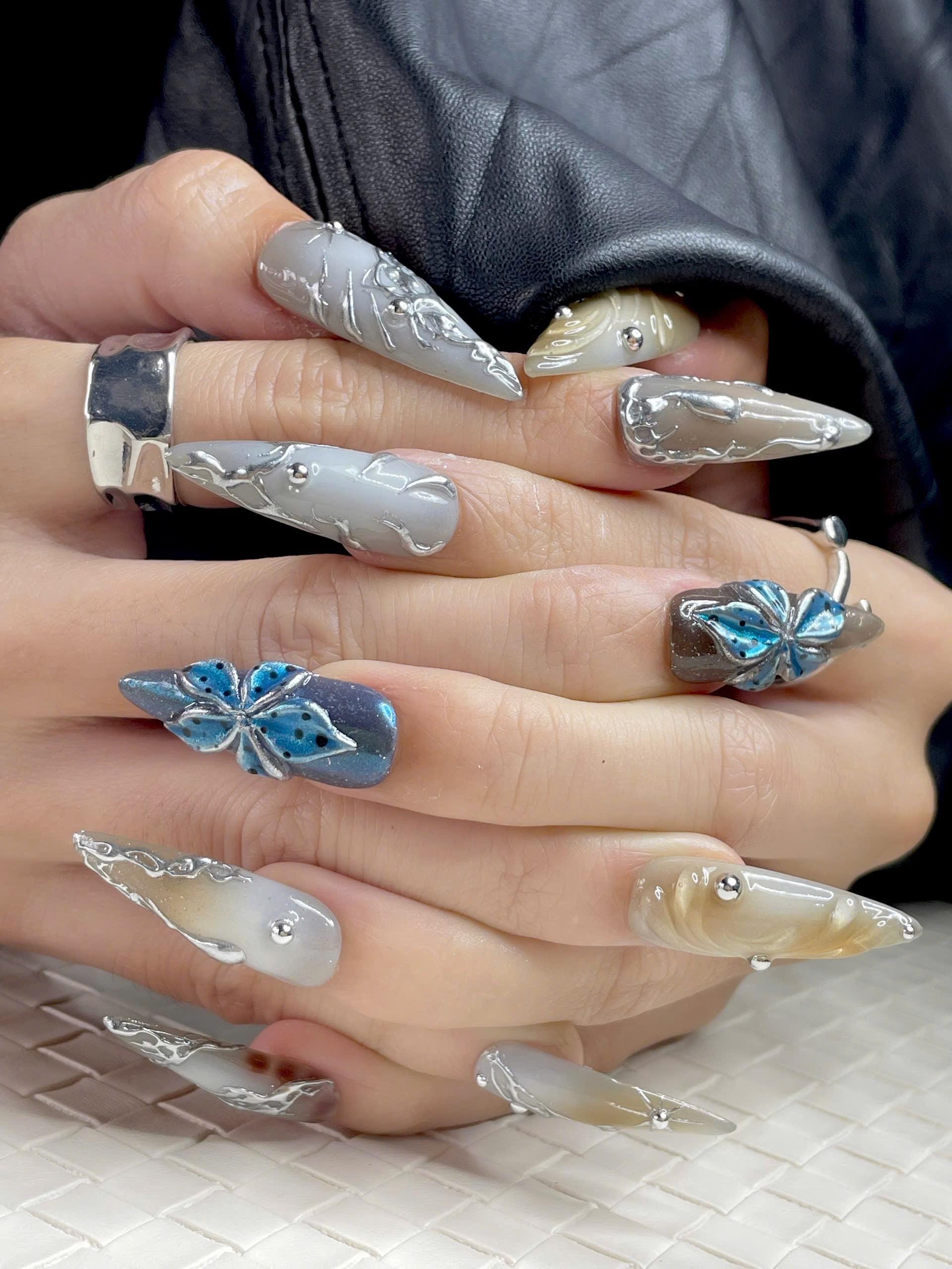 Where molten silver meets midnight skies 🌌🦋 Midnight Flutter blends earthy neutrals, bold blue butterflies, and liquid chrome elegance for a mysterious, enchanting look