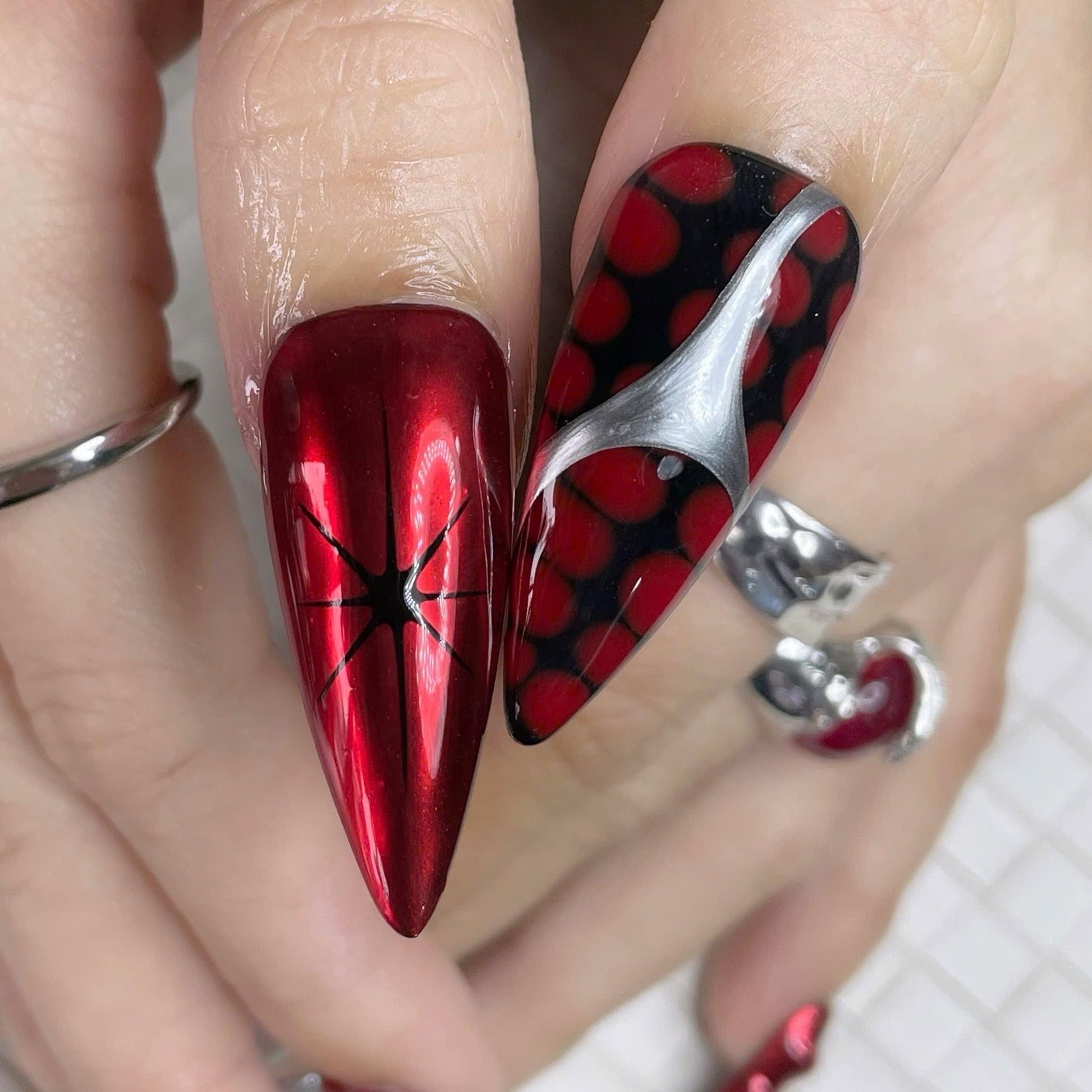 #ScarletVenomNails #ChromeNails #GothicNails #RedAndBlackNails #VenomNails #StilettoNails #HandmadePressOnNails #GothicGlam #AlternativeStyle #ChromePressOns