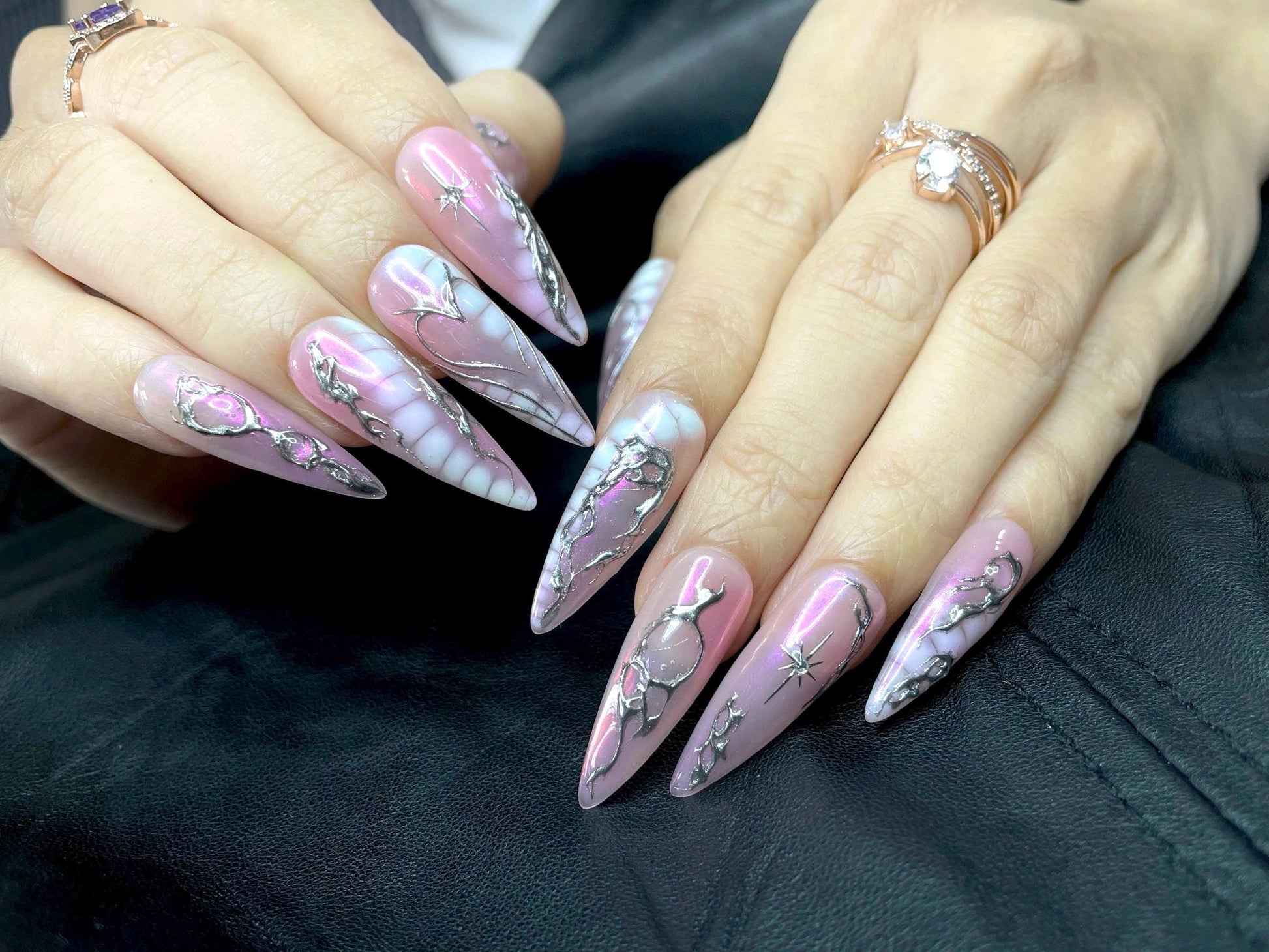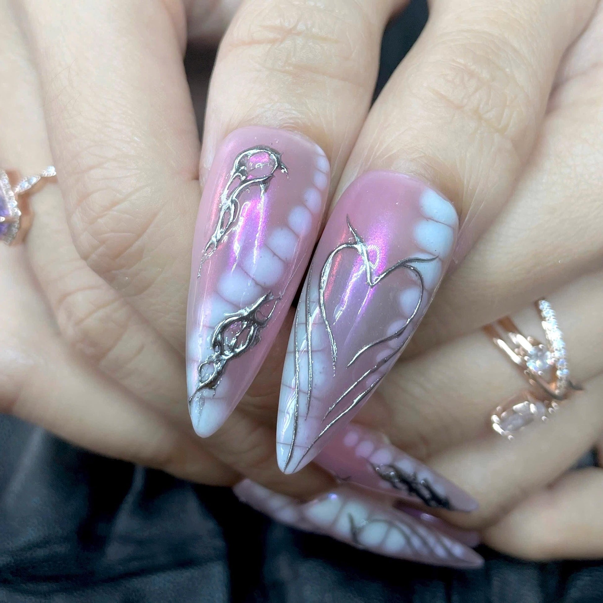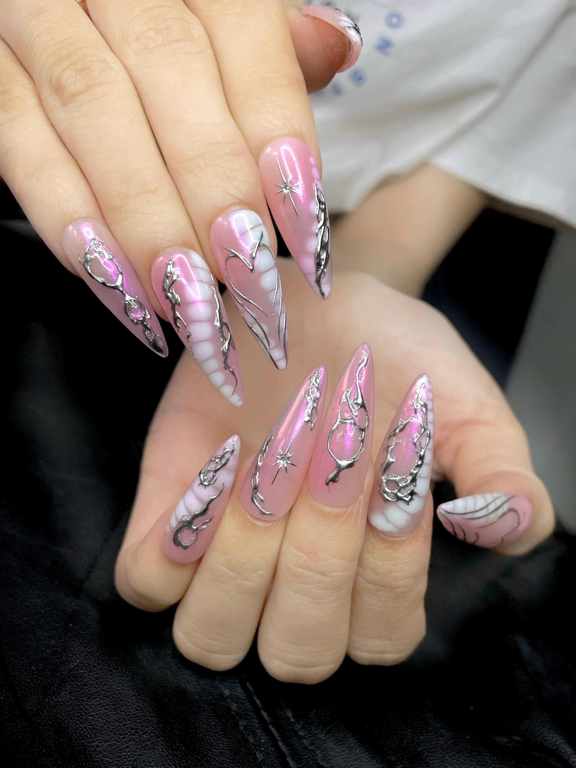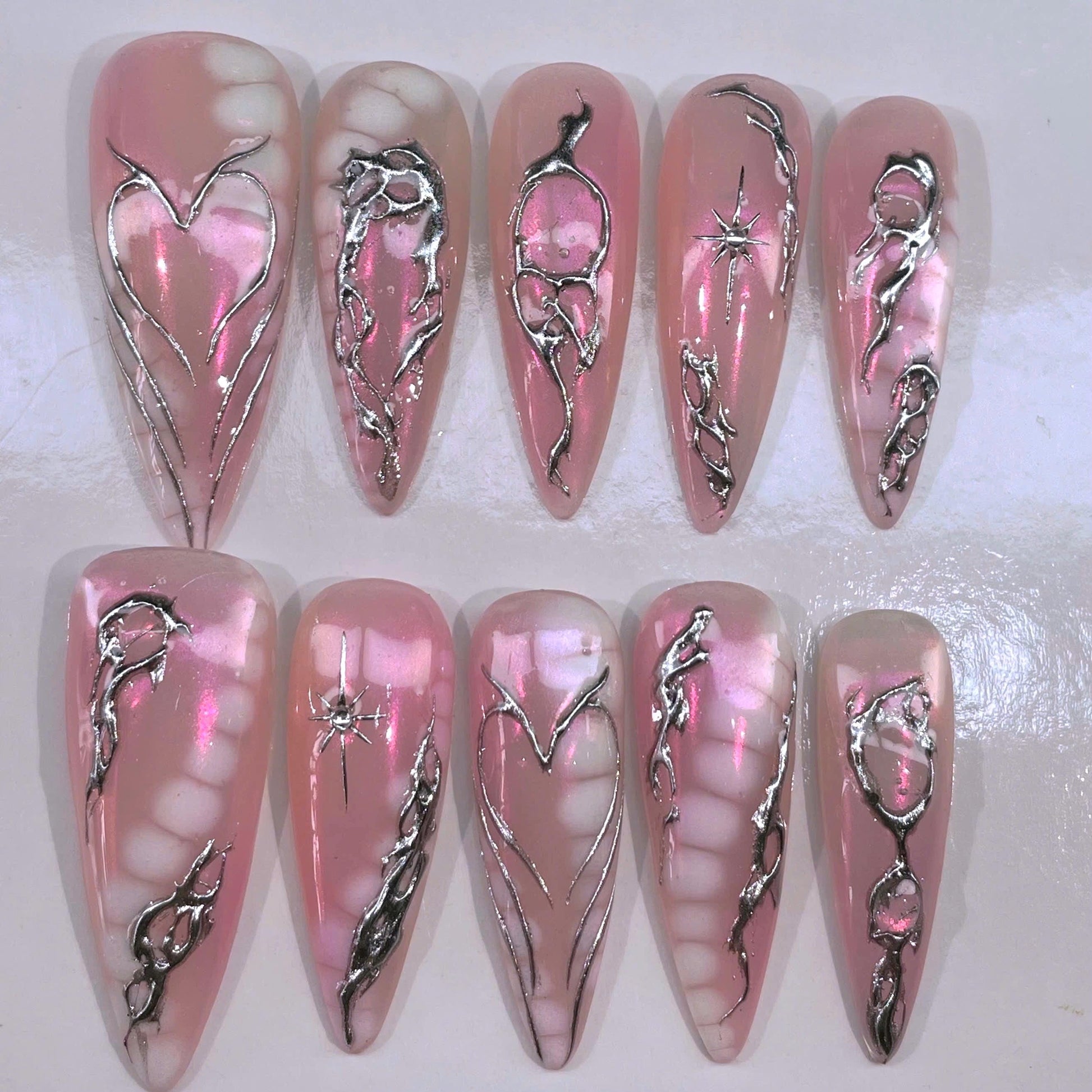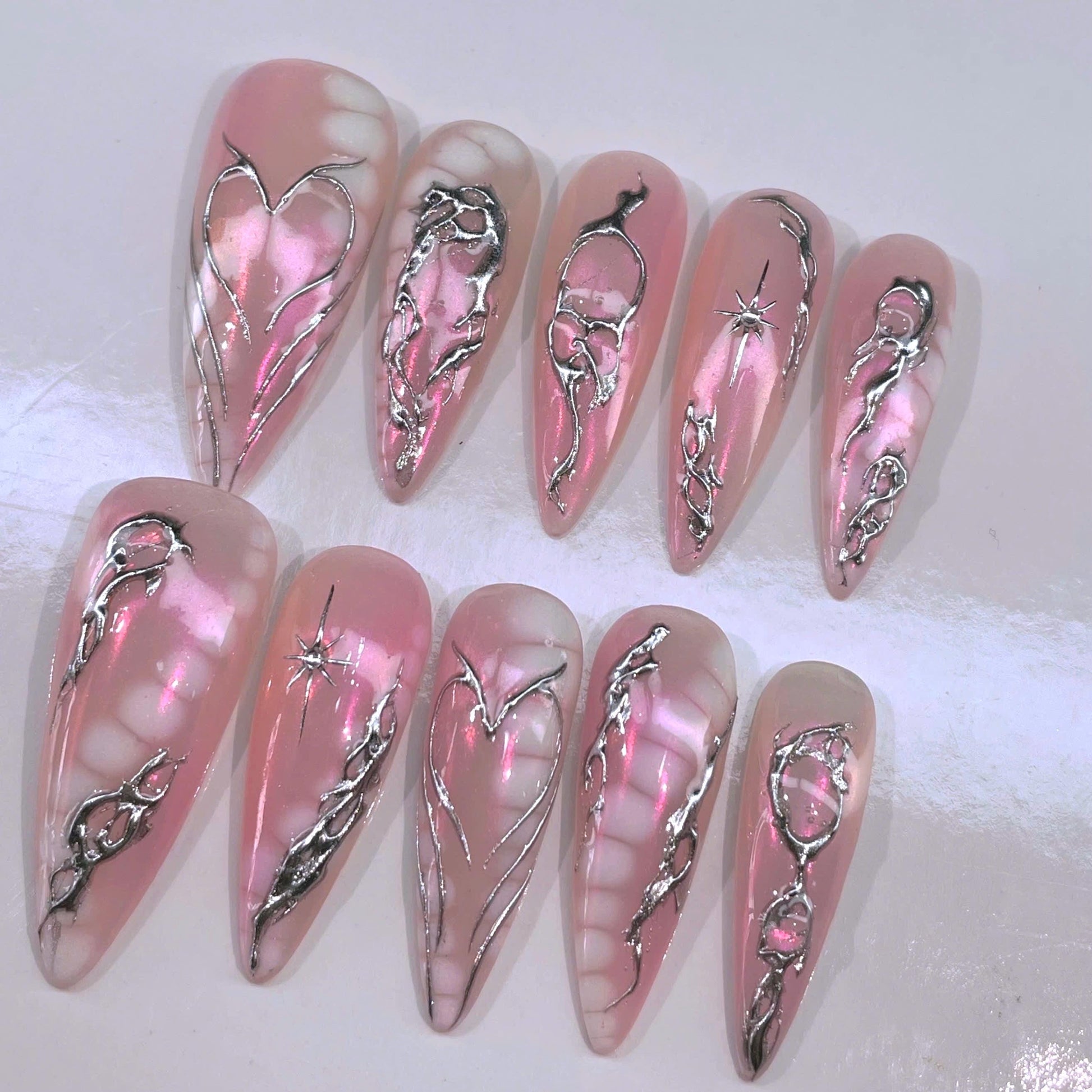 #PinkNails #HeartNails #ChromeNails #RomanticNails #ValentinesNails #MoltenMetalNails #GothicNails #PressOnNails #HandmadeNails #SilverNails