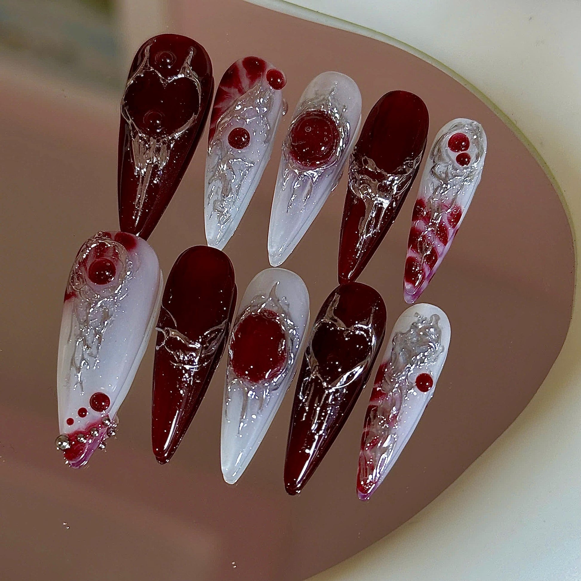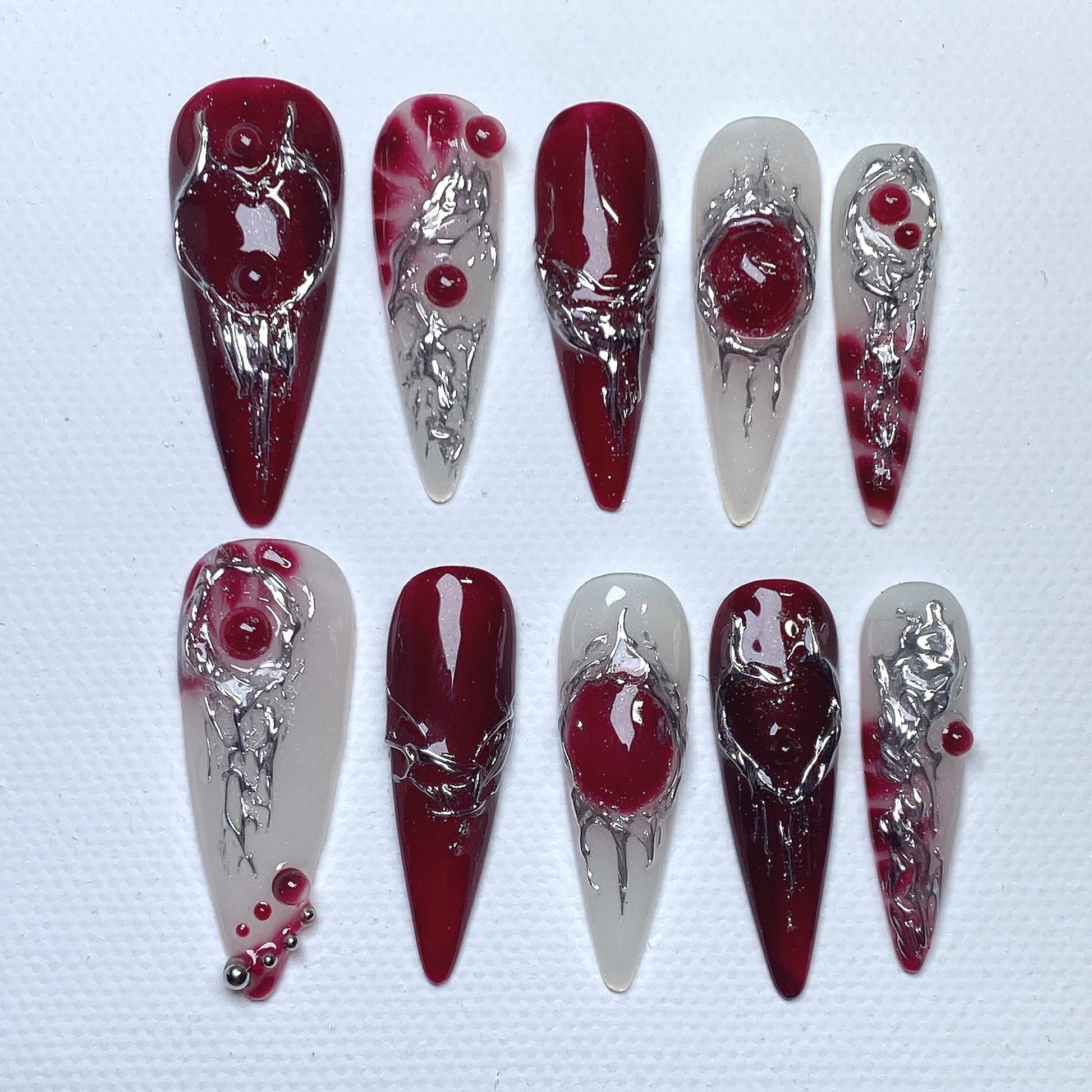 #ScarletAlchemy #GothicNails #RedChromeNails #MoltenNails #LuxuryPressOns #VampyNails #HandmadeNails #StatementNails #AltBeauty #DarkGlam #BloodRedNails #AlchemyInspired #PressOnNails #NailMagic #BoldNailDesign