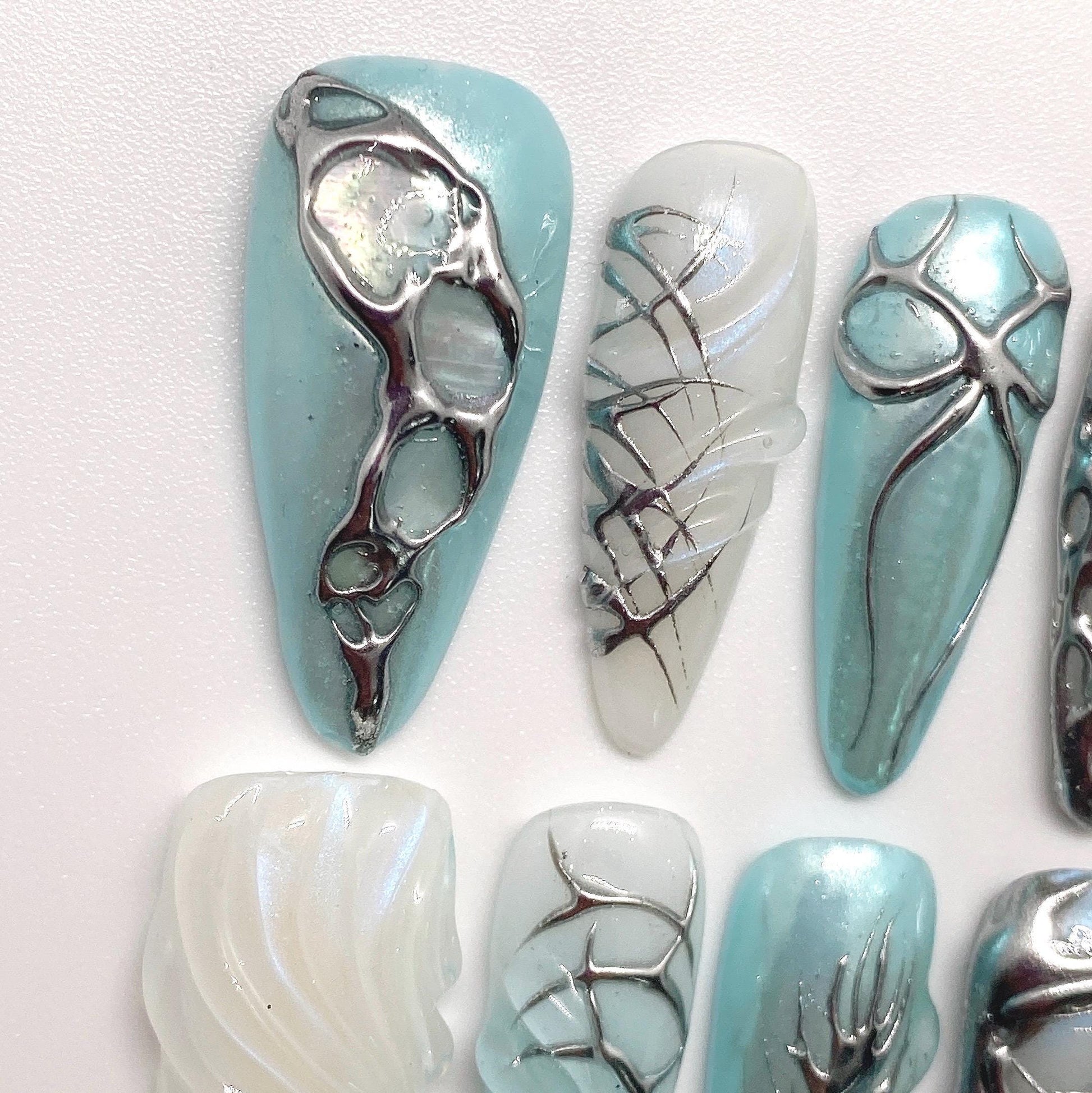 #SirensCore #AquaNails #ChromeNails #OceanNails #MermaidNails #FuturisticNails #3DNailArt #MoltenMetalNails #BluePressOnNails #HandmadeNails #AlternativeNails #CelestialNails #FantasyNails #EtsyNails #StatementNails
