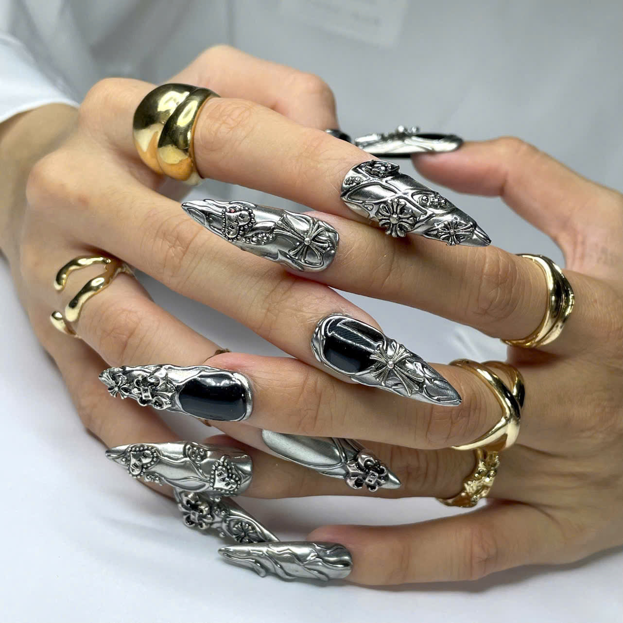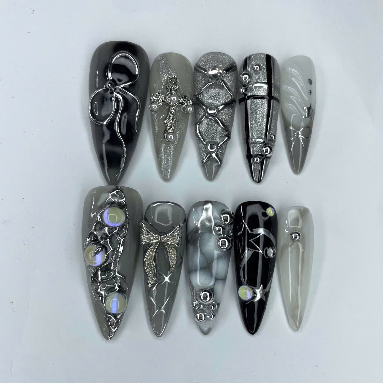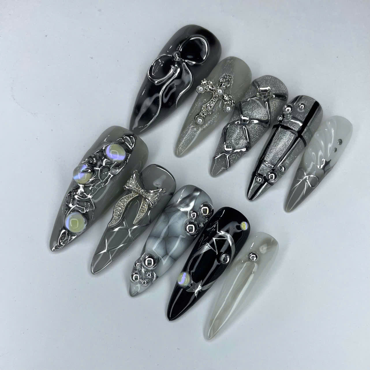 Unleash your dark glamour with Midnight Alloy, a bold black-and-silver press-on nail set inspired by metallic elegance and gothic allure. Featuring 3D cross and bow charms, chrome chain textures, and marble details, this set brings a fierce, high-fashion edge to your look. Perfect for night outs, concerts, or anyone craving a statement manicure.