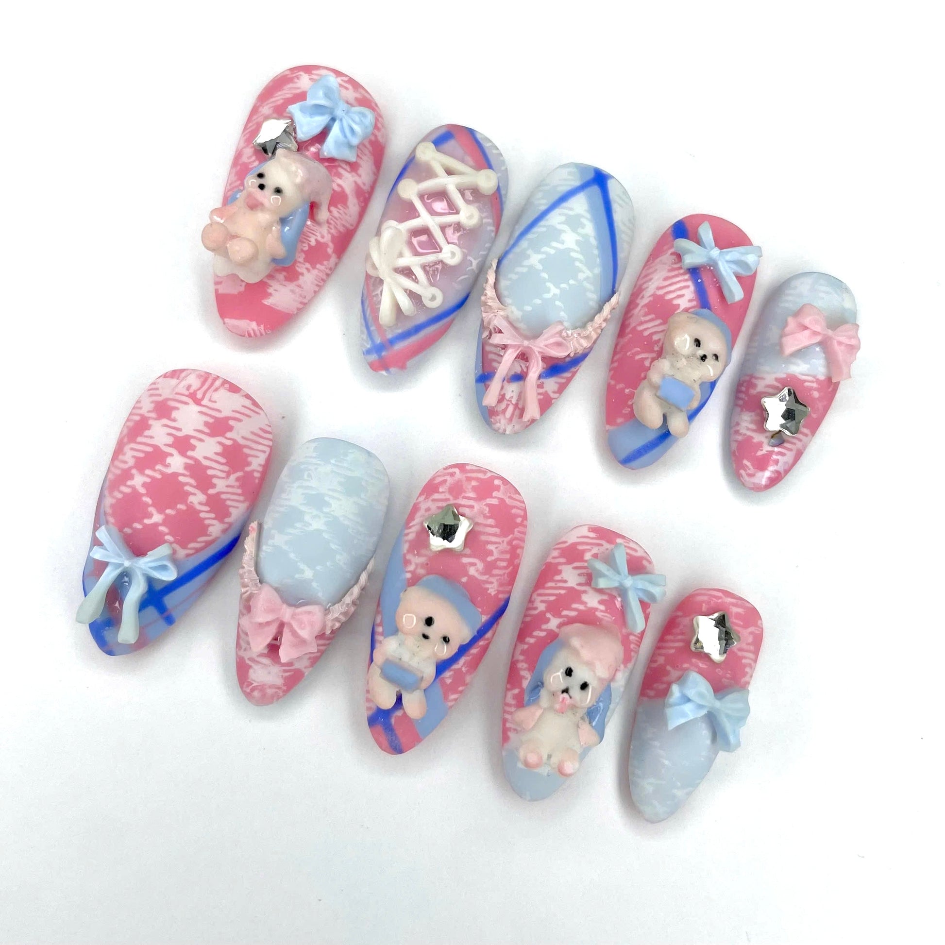 Step into a dreamy pastel world with this adorable handmade press-on nail set featuring 3D teddy bear charms, soft pink & baby blue tones, delicate bows, and glossy Y2K-inspired details. Sweet, playful, and ultra-cute — this set is perfect for anyone who loves kawaii, soft-girl, or dollcore aesthetics.